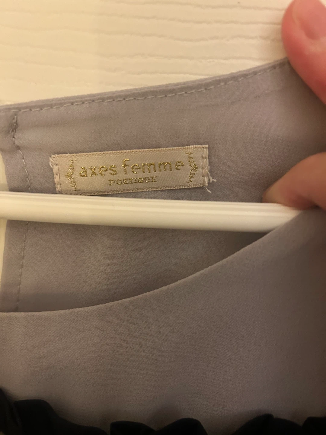 Selling an axes femme blouse and skirt set in grey and black. The blouse has a grey top and black bottom, with floral accents on the sleeves. The skirt is grey with a ribbon tie at the waist. It's a cute and stylish set! I only wore them once, in great conditions like new clothes.