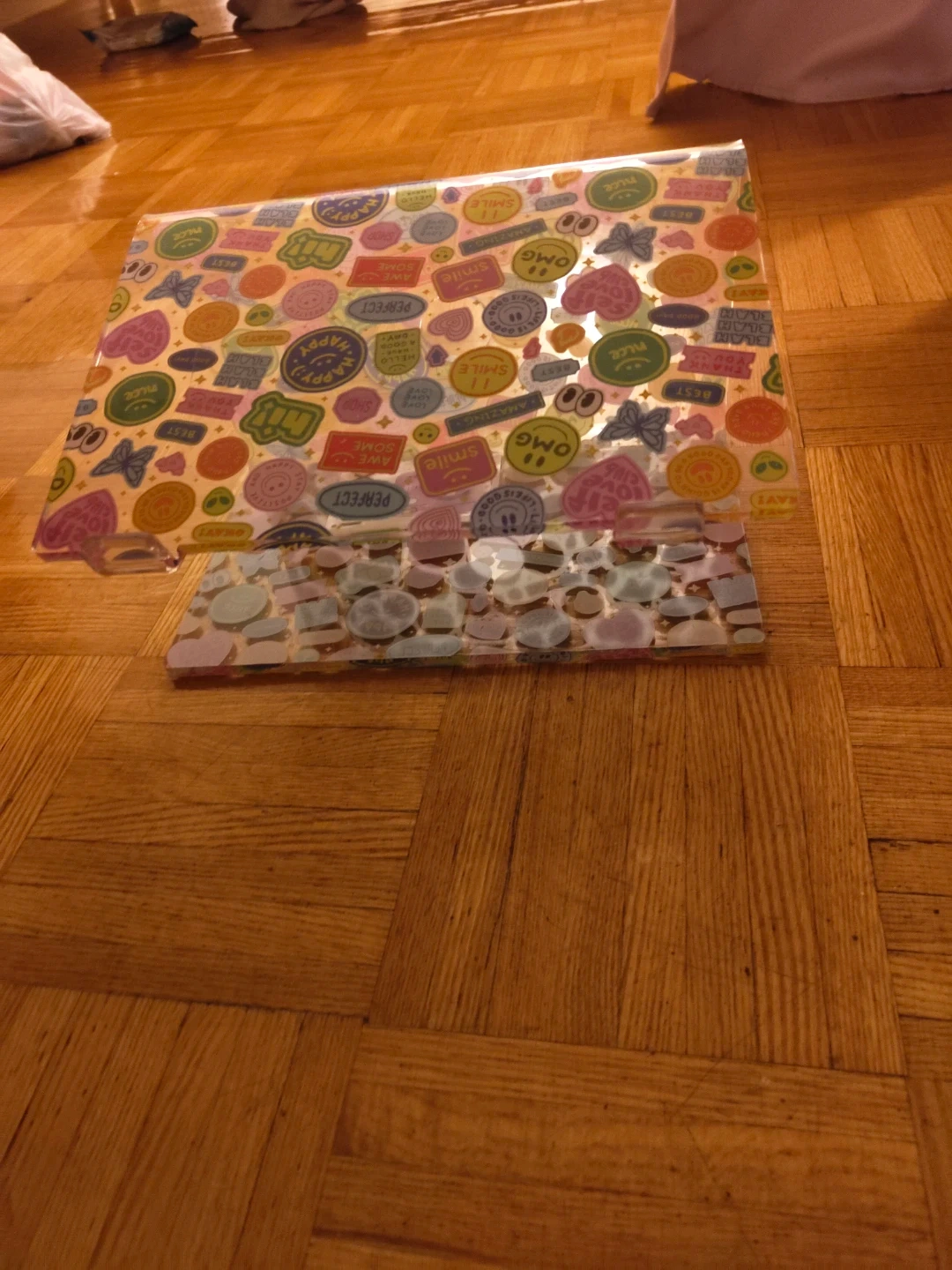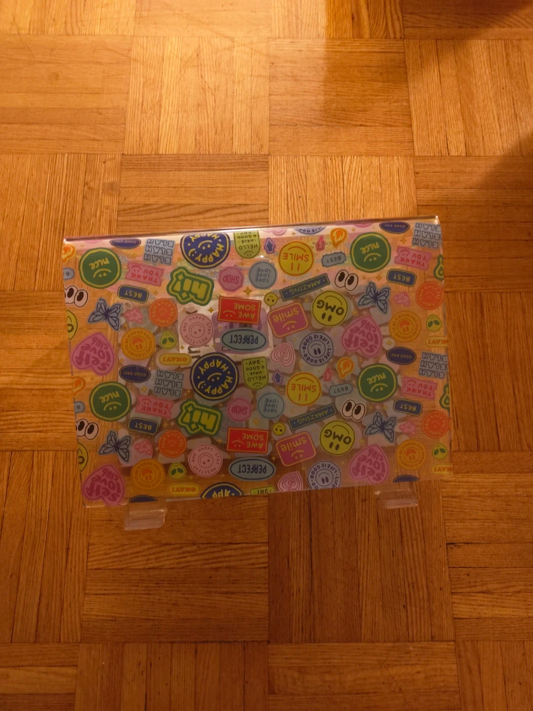 This is a clear plastic organizer holder featuring a vibrant collage of stickers. It's perfect for storing small craft supplies or stationery. The translucent design makes it easy to see contents at a glance!