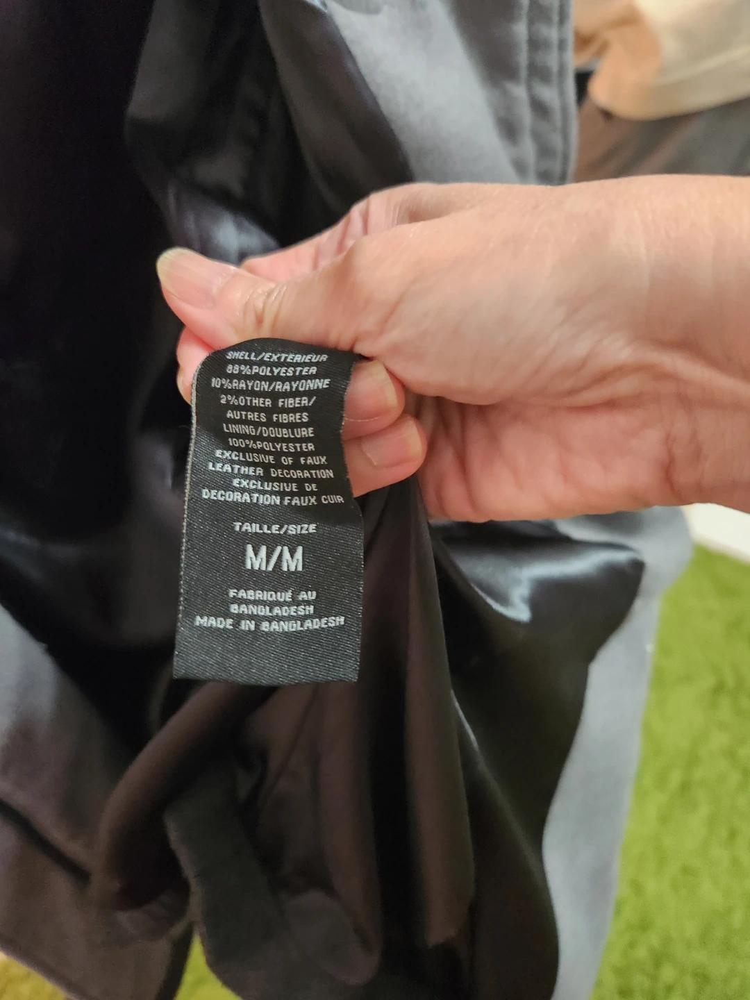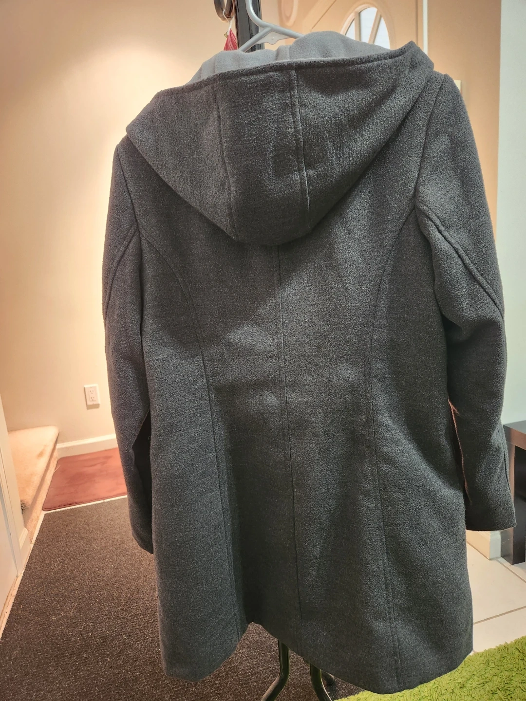 This Suzy women's hooded duffle coat is grey and size M/M. It's made from 88% polyester, 10% rayon, and 2% leather fiber with a polyester lining. Features toggles and a zipper closure. Please note that the leatherette from the toggle closures are peeling off but it is unnoticeable and still stylish. Perfect for Spring weather.