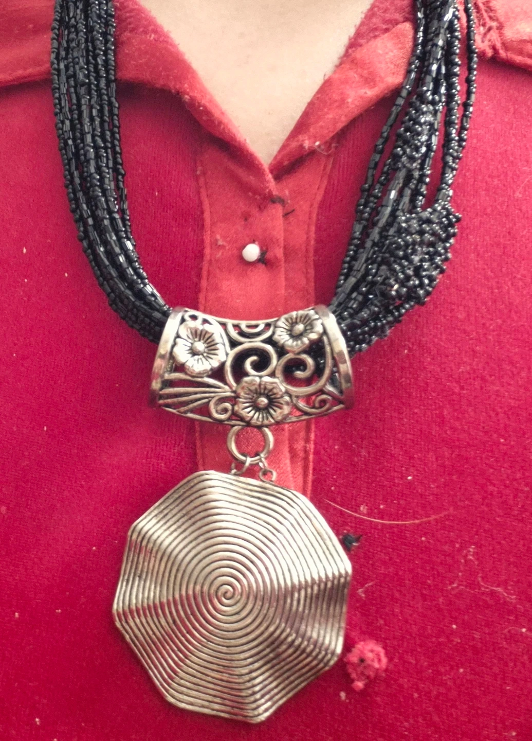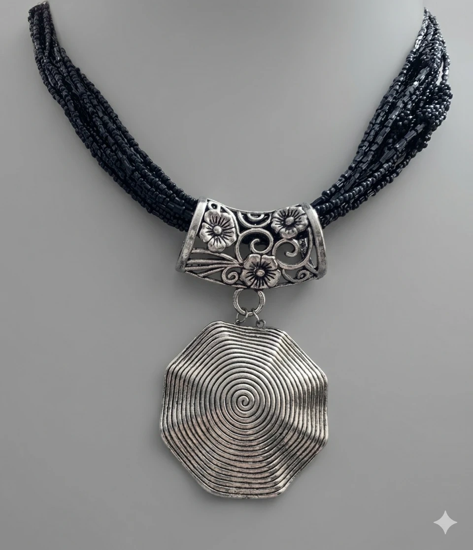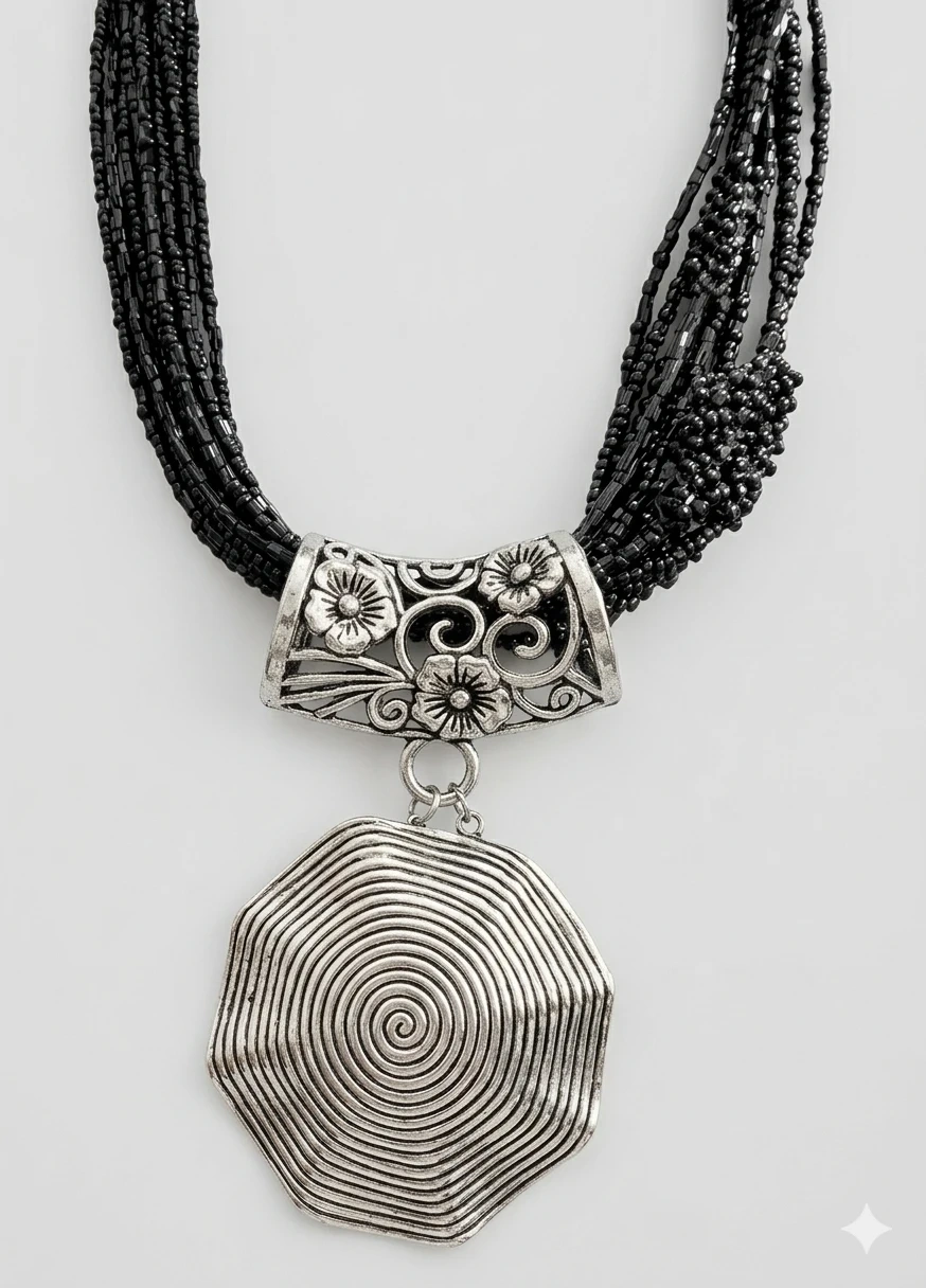 Multi-strand black beaded necklace featuring a large, silver-tone pendant with a prominent spiral design. The pendant hangs from a decorative silver-tone piece with floral cutouts. It's secured with a lobster clasp and an extender chain for adjustable length. This necklace adds a bold statement to any outfit!