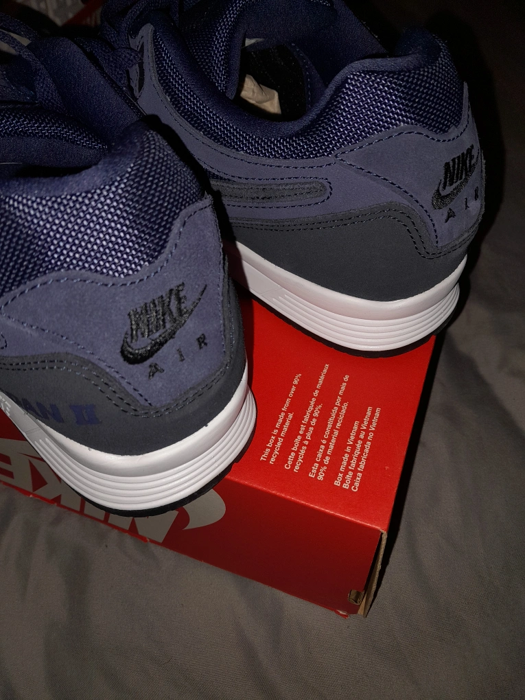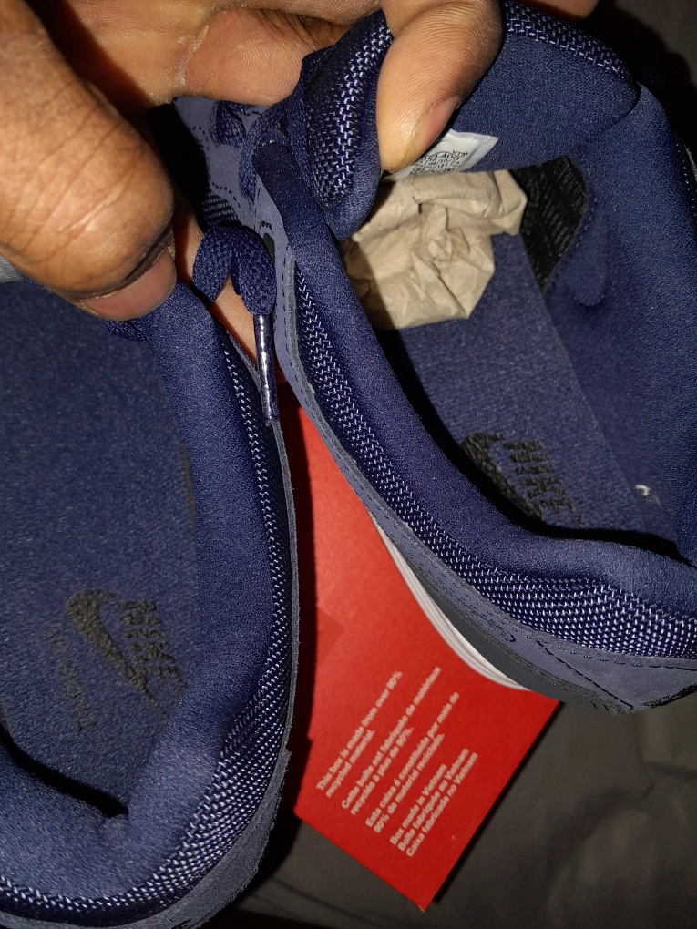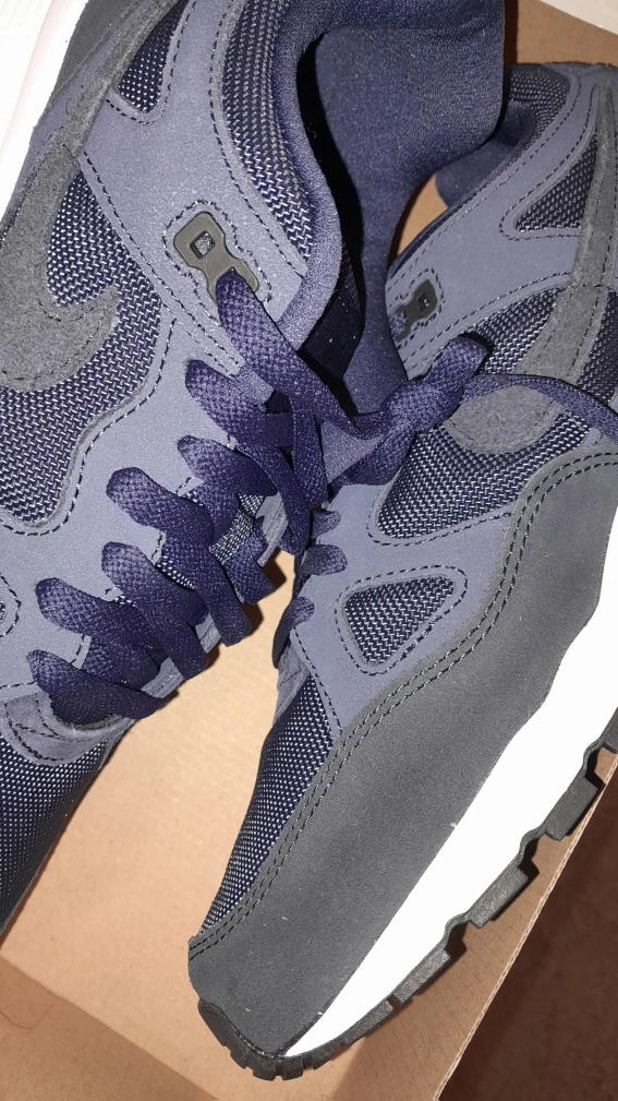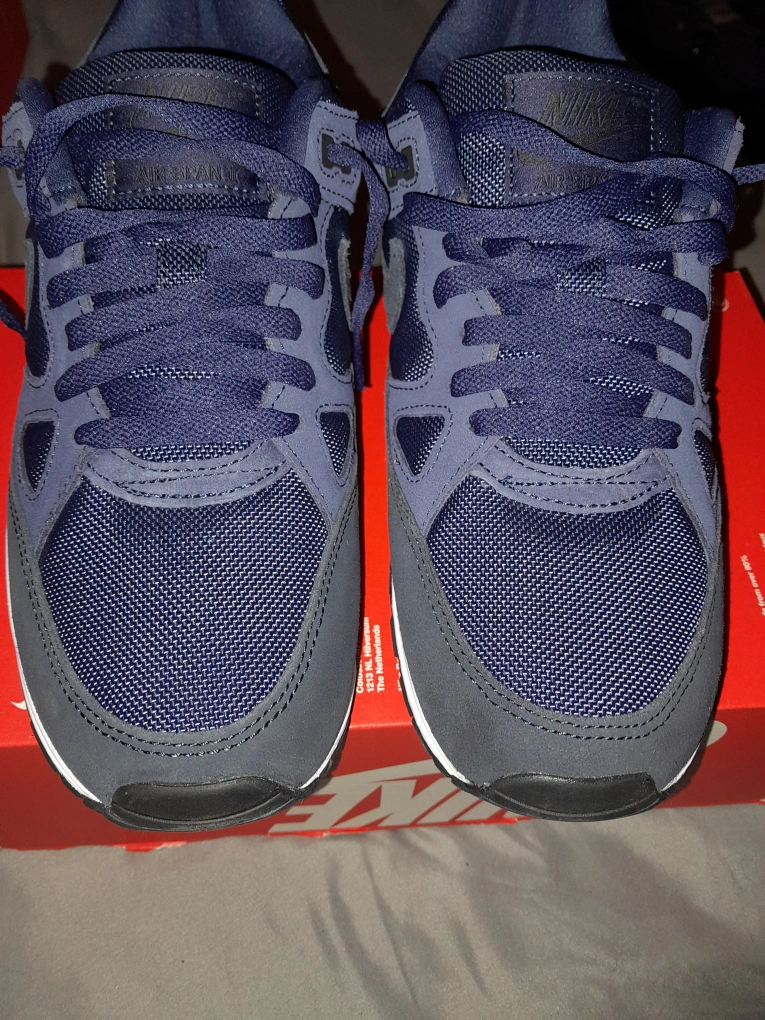 Pair of navy blue Nike Air Max SC running shoes. Size 9.5. New in box. Mesh and suede upper. Comfortable design. Great for everyday wear or workouts.