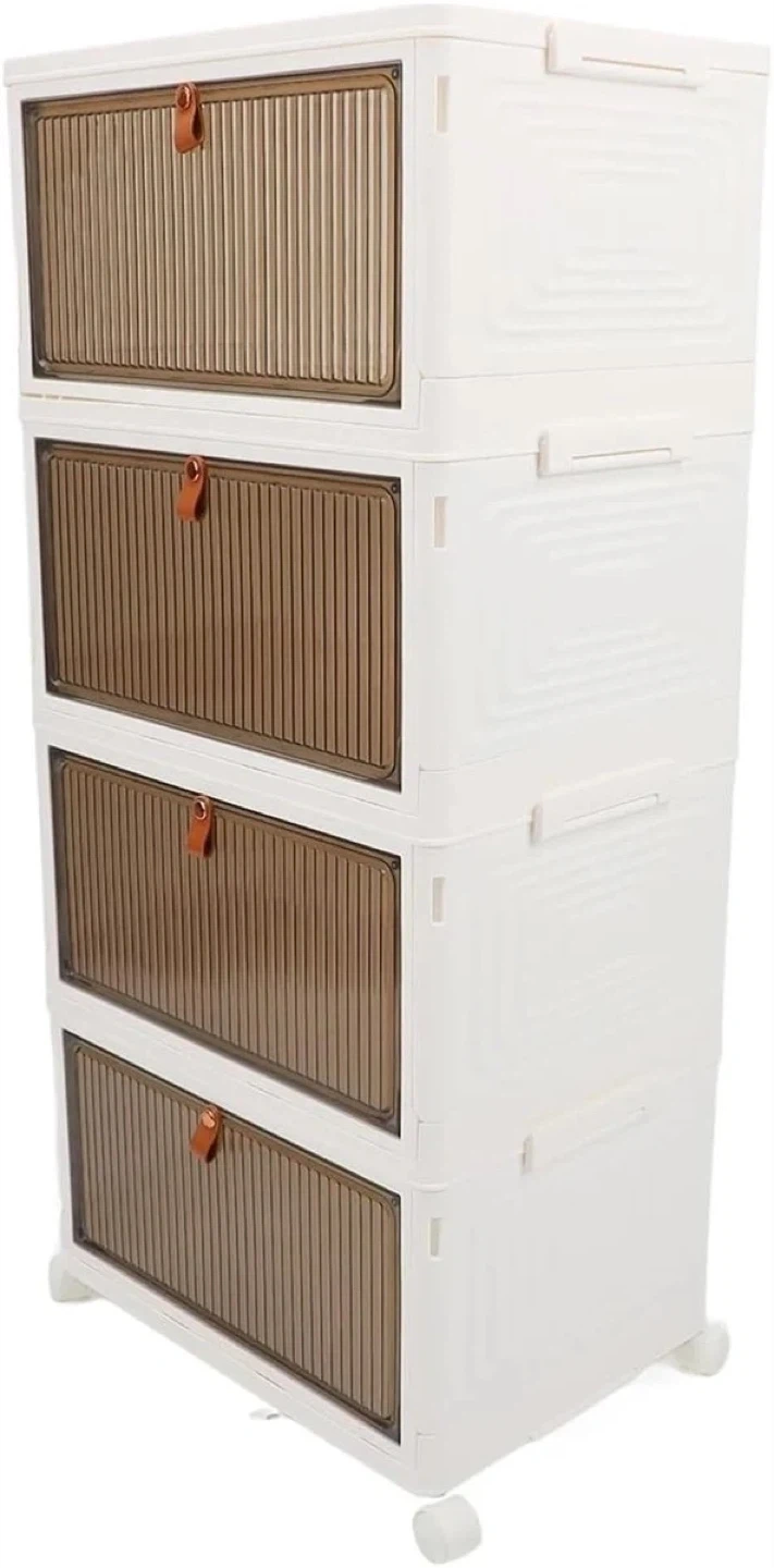 This stackable storage cabinet comes with four drawers and wheels for easy mobility. It's made of plastic with brown translucent drawer fronts. The overall dimensions are 82cm (H) x 39cm (W) x 28cm (D). It's useful for organizing various items around your home.