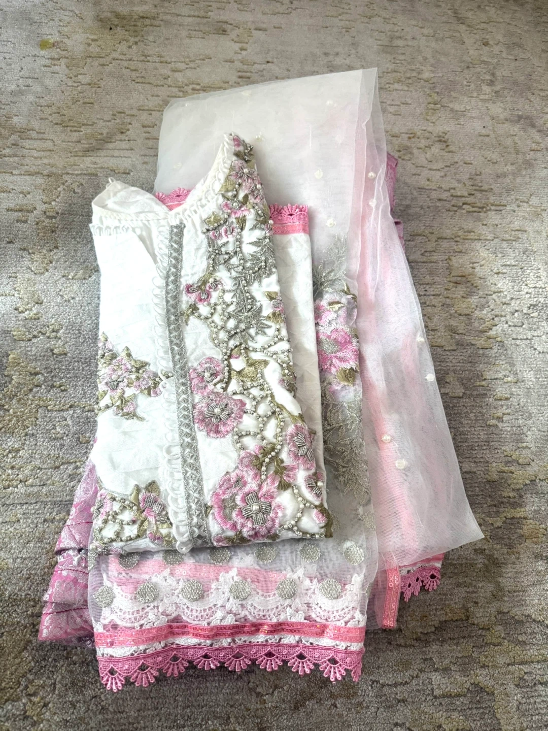 Beautiful pink and white Pakistani suit with intricate embroidery shirt and dupatta is net material and banarsi heavy lots of flare gharara. Perfect for special occasions!