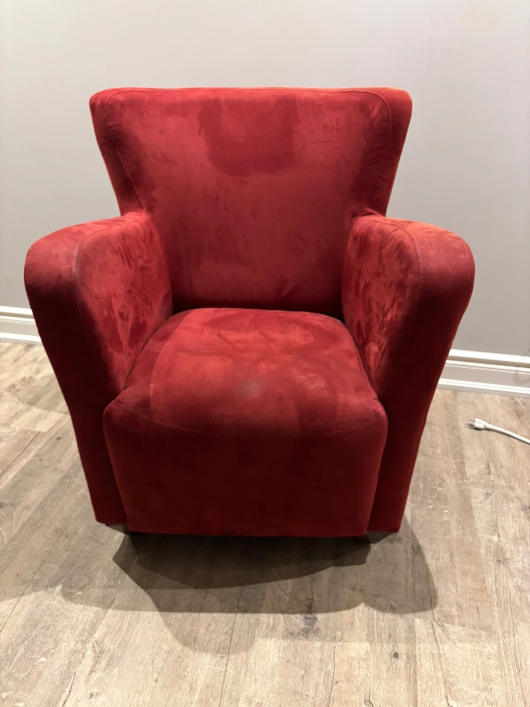 Comfortable red armchair with a suede-like fabric. Offers a plush seating experience. Suitable for a reading nook or extra seating in a living space.