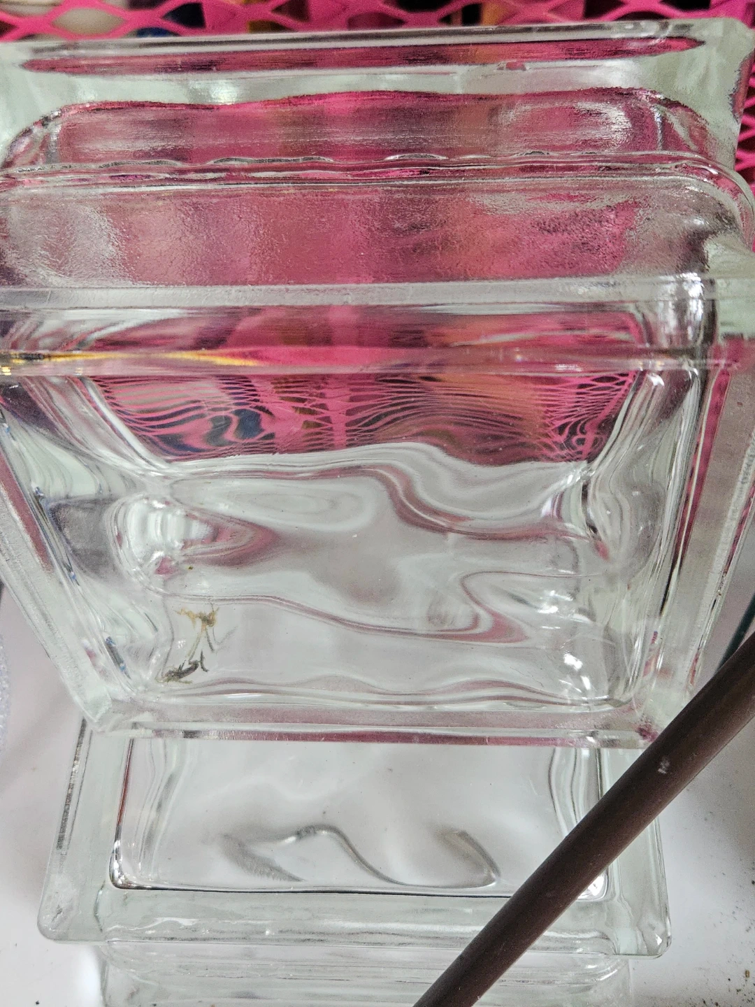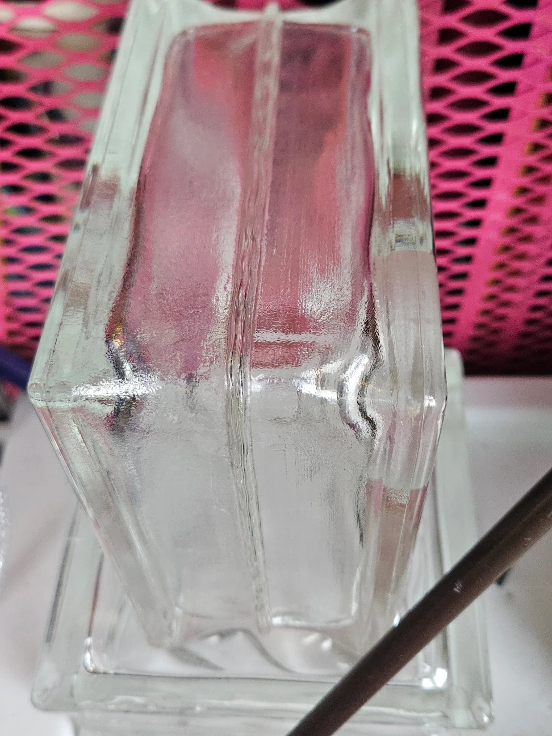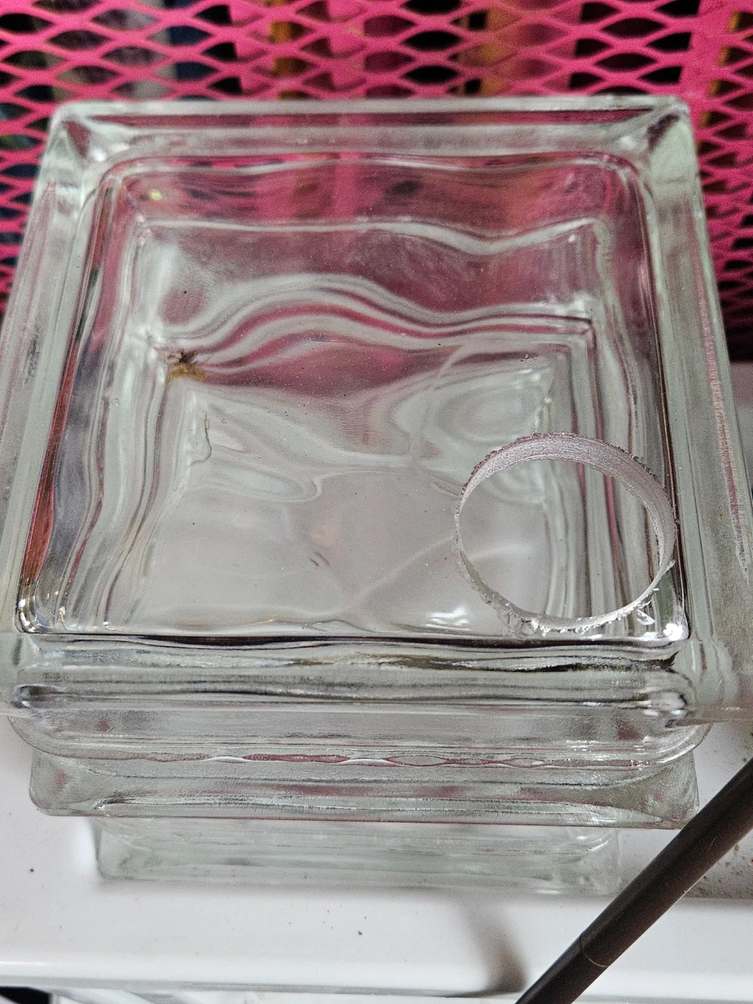 Clear glass block with a pre-drilled hole. Material is glass. This block could be used for crafts or as a decorative accent.