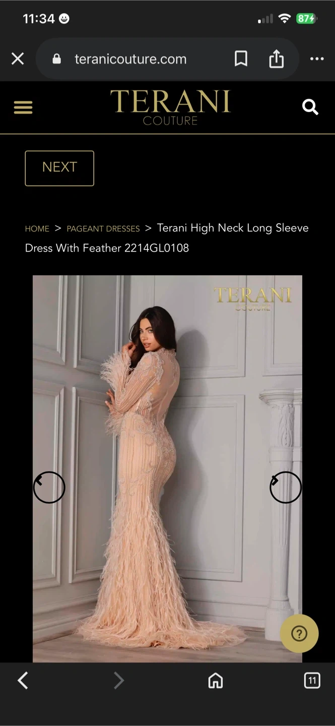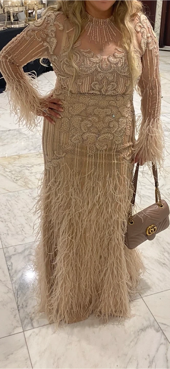 Exquisite Terani Couture gown with a high neck and long sleeves. Features intricate beading and delicate feather accents throughout. Made from tulle fabric in a blush hue. Perfect for formal events!