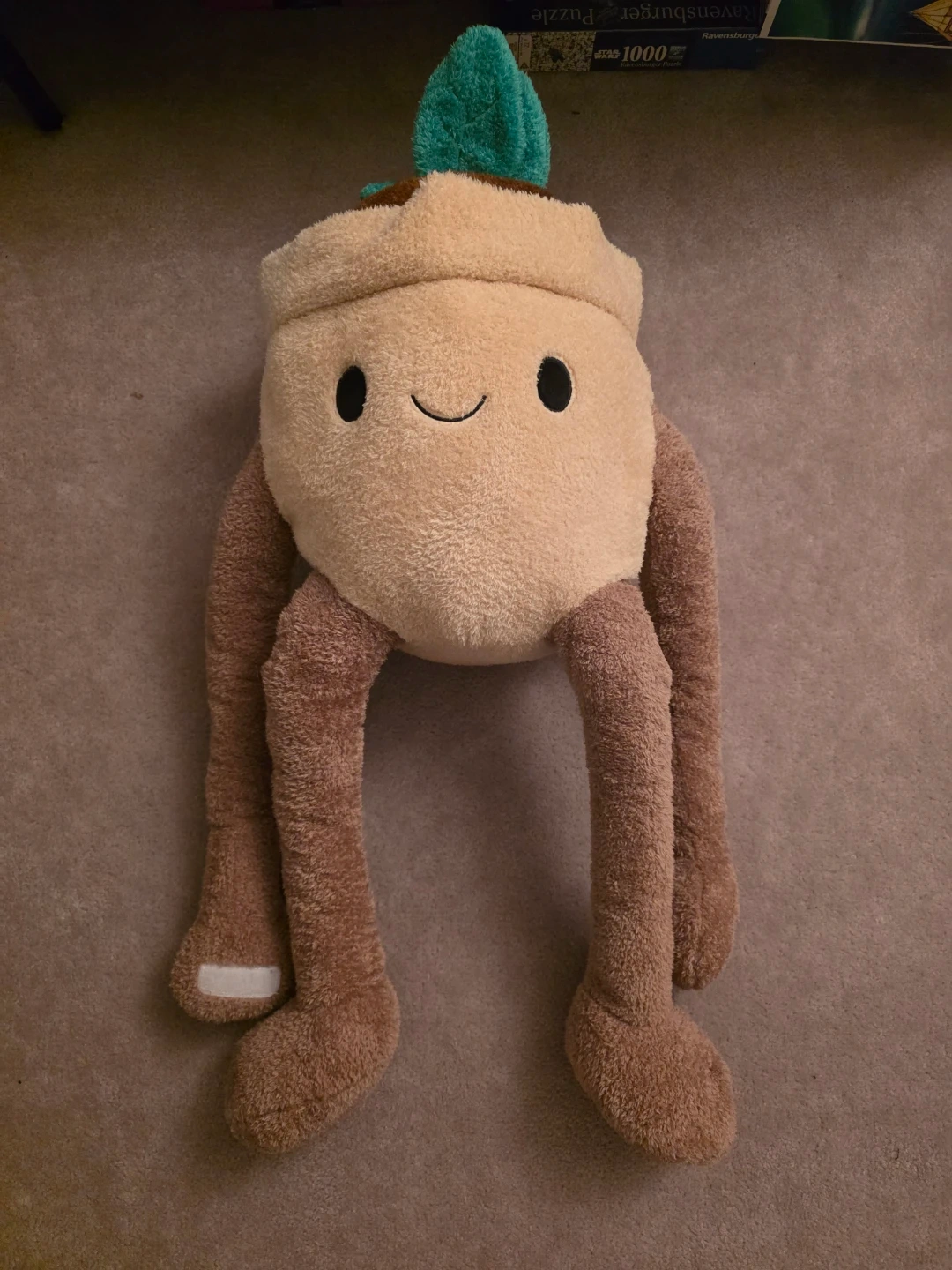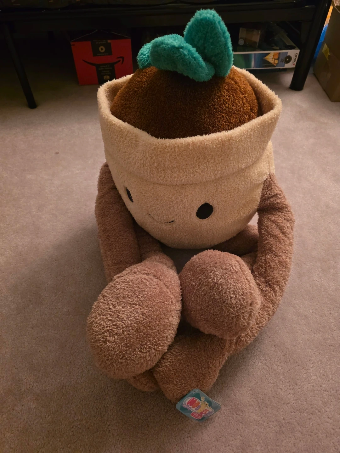 This adorable Potted plant plush toy is super soft and huggable. It's a fun character with long dangly legs and a cute smiling face. It measures about 70cm from the top of the plant to the bottom of its feet.