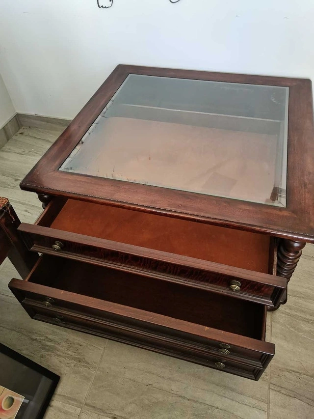 Elevate your living space with this elegant wood coffee table, featuring a glass top and three functional drawers for discreet storage, offered in used condition. This coffee table is a statement piece, blending functionality with classic design. The glass top adds a touch of modern elegance, while the three drawers provide convenient storage for your living room essentials. This item is in used condition, showing some signs of wear that add to its character. Perfect for adding a touch of sophistication to any living room. * Glass Top * 2 Drawers * solid Wood finish large heavy 40"x40"x20" If the ad is still up, it's still available! pu near chinook station