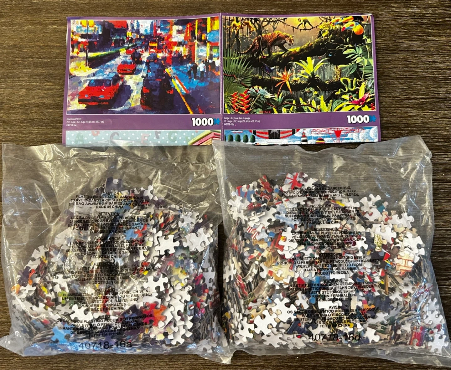 Two 1000-piece puzzles are included: 'Jungle Life' and 'Downtown Street'. Each puzzle measures 23.5 in x 15.5 in. The pieces come in two separate sealed bags.