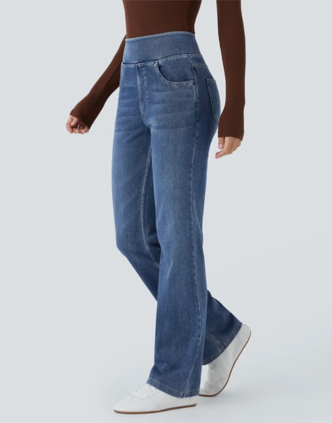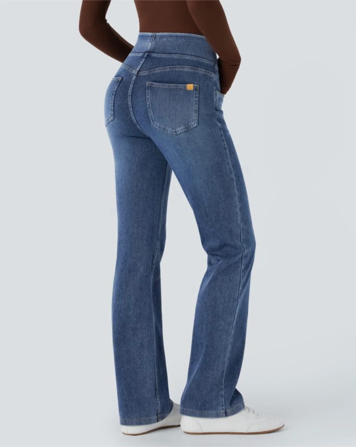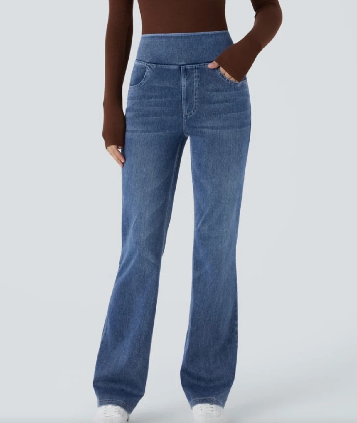 These are Halara Flex high waisted bootcut jeans in Royal Blue Denim.