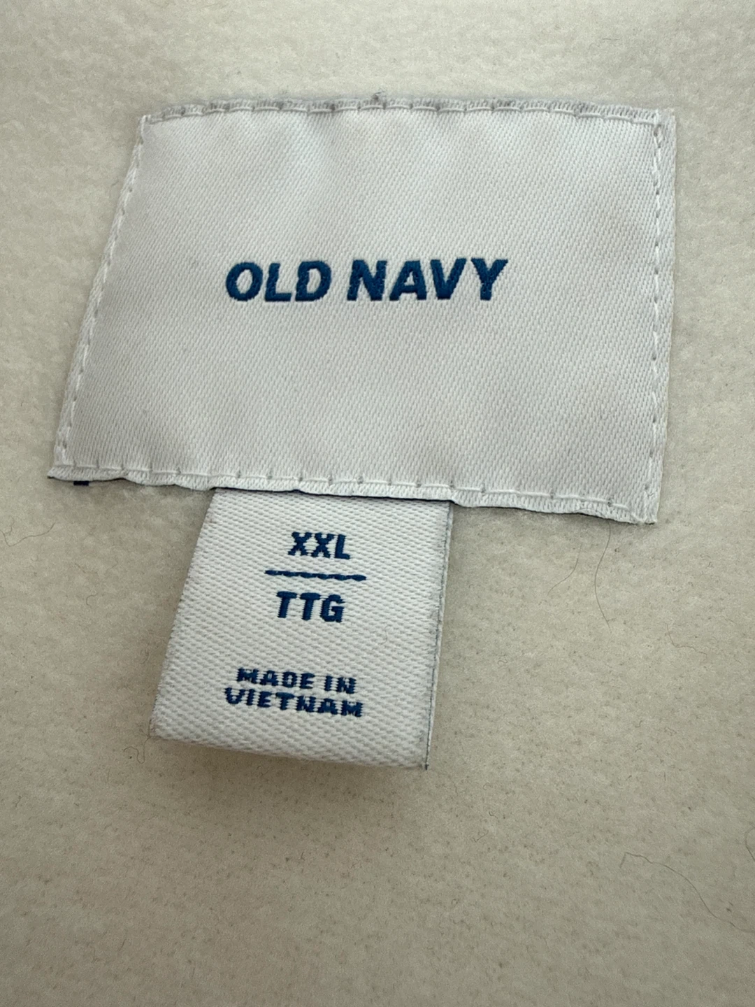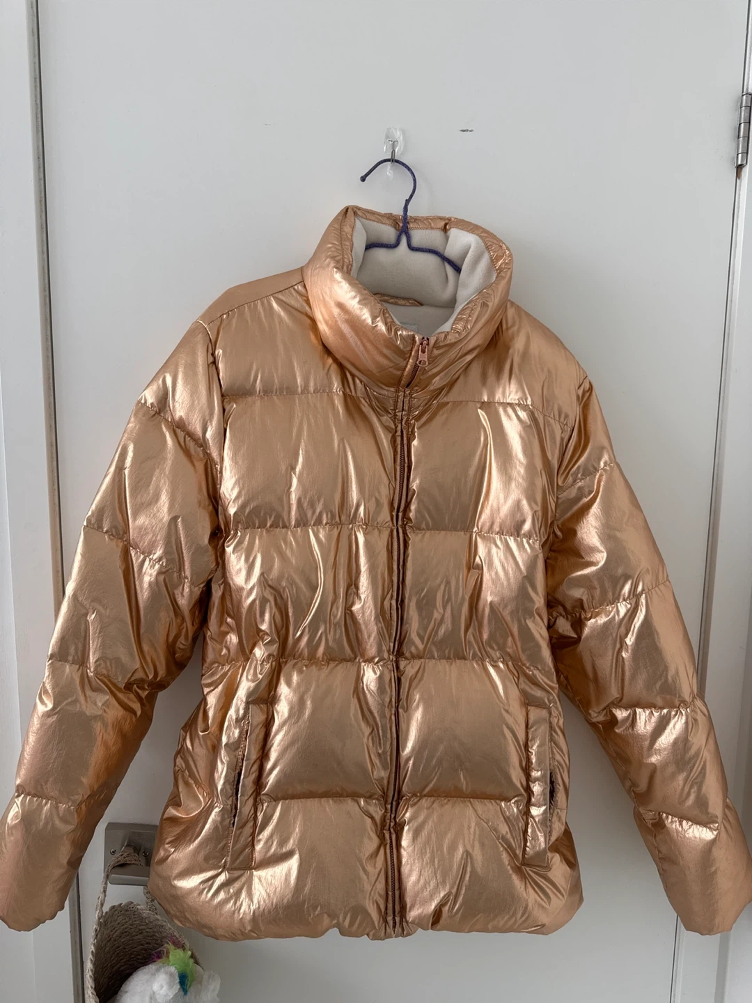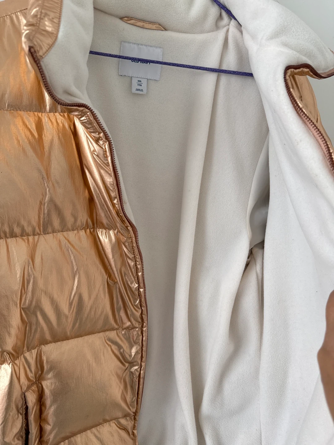 This is an Old Navy puffer jacket in a rose gold metallic finish. It's a size XXL and features a cozy fleece-lined interior. Perfect for staying warm and stylish!