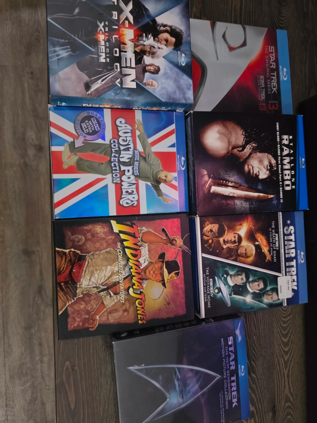 Get your hands on a collection of popular movie Blu-rays. This lot includes the X-Men Trilogy, Austin Powers Collection, Indiana Jones: The Complete Adventures, Rambo Trilogy, and multiple Star Trek collections. All discs are in Blu-ray format.