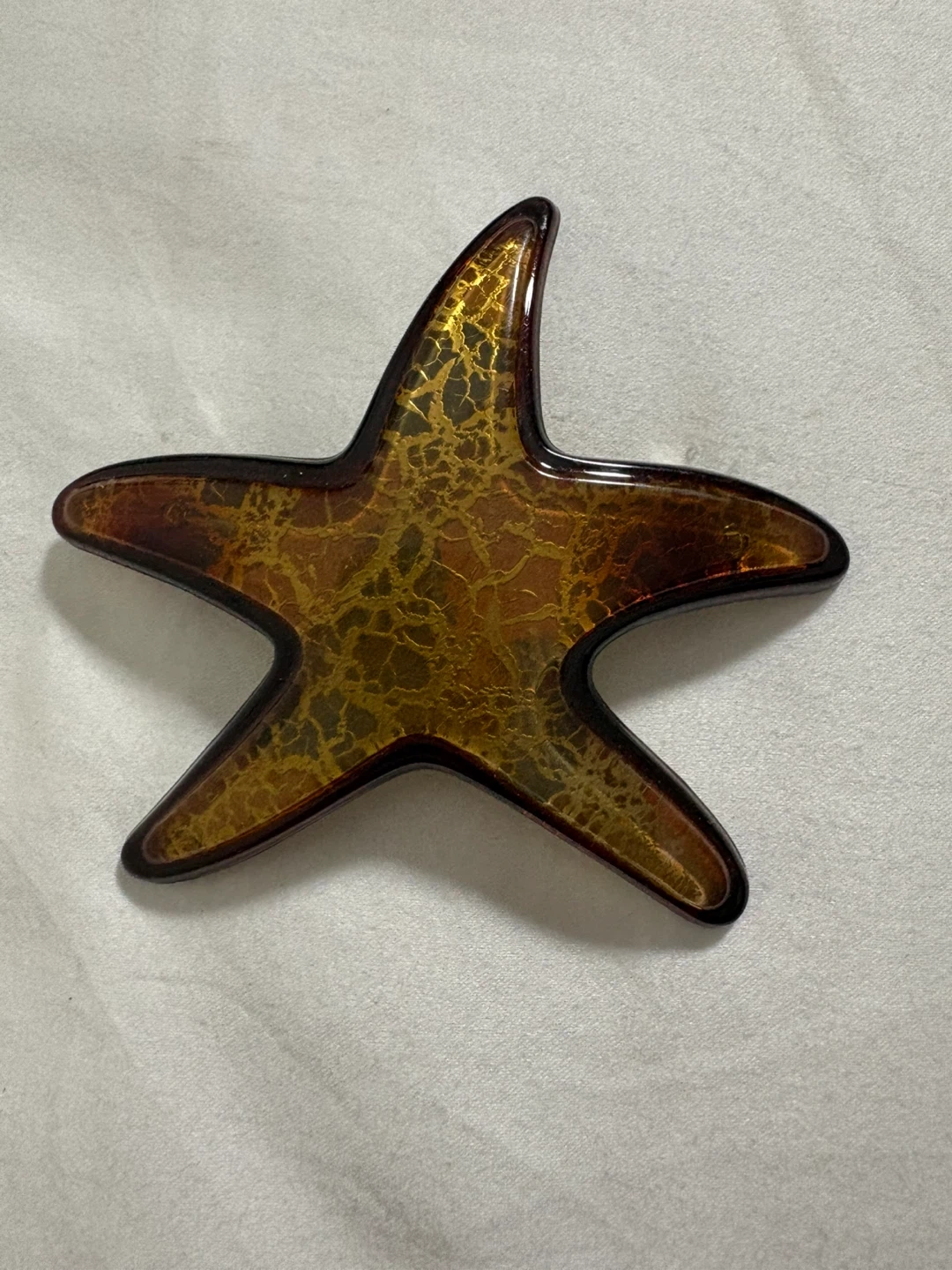 This is a decorative starfish hair clip from Medusa's Heirlooms. It features a gold-toned, textured finish with a dark amber-colored overlay. The clip mechanism appears secure and functional.
