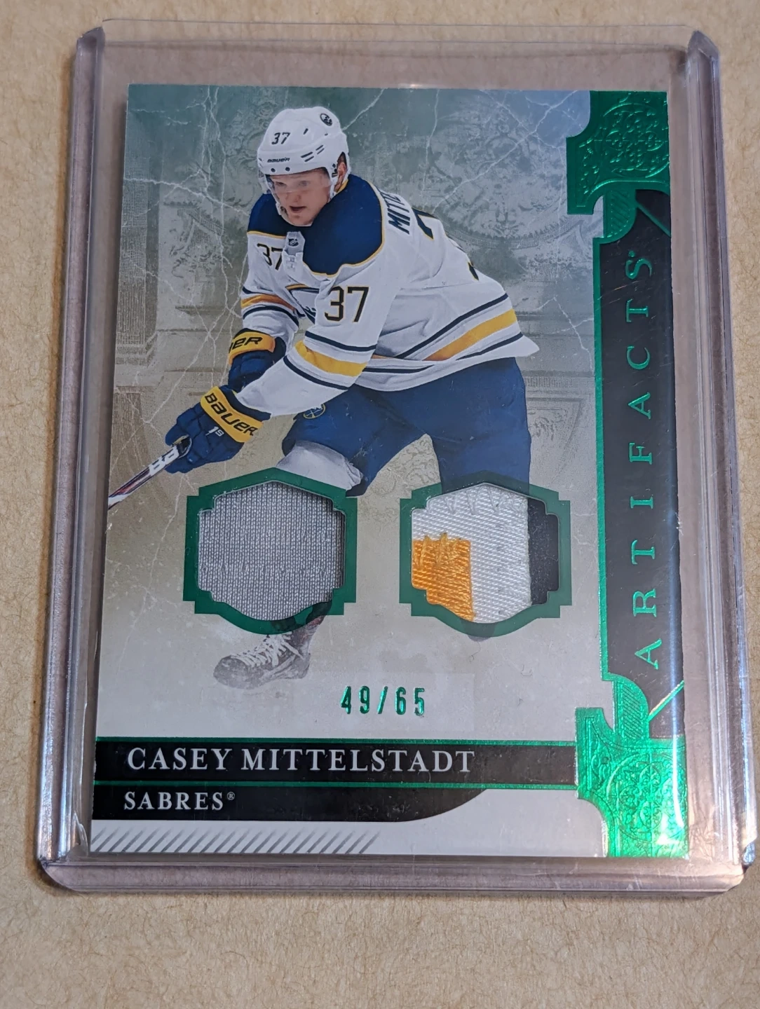 This is a 2019-20 Upper Deck Artifacts hockey trading card featuring Casey Mittelstadt. It includes game-used memorabilia swatches/patch. The card is numbered 49 out of 65. It's a collector's item for hockey fans.