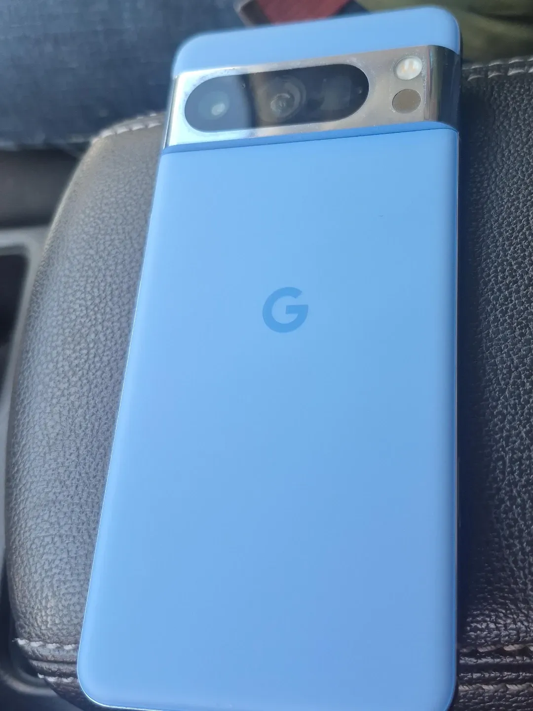 This is a Google Pixel 8 Pro smartphone in a light blue colour. It has a distinctive camera bar at the top. The phone has a 'G' logo on the back. 256GB Comes with charging cord.