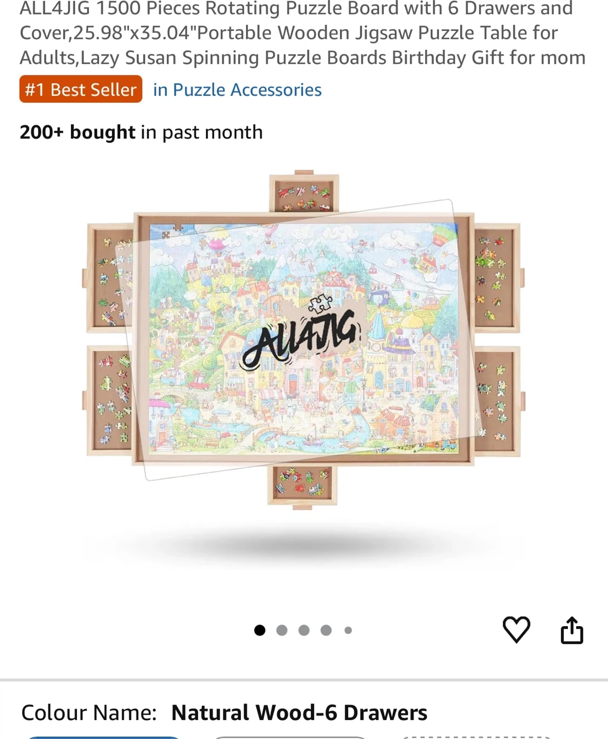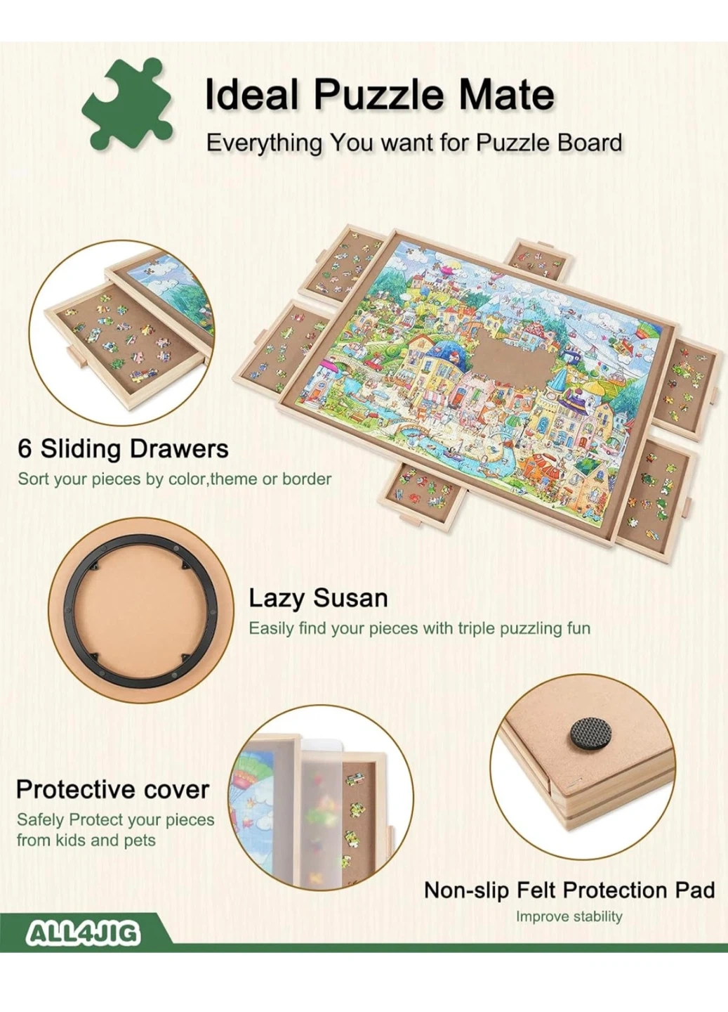 This ALL4JIG puzzle board features 6 sliding drawers for sorting your puzzle pieces. It includes a protective cover to keep your work safe. The board itself is a Lazy Susan for easy rotation and piece access.