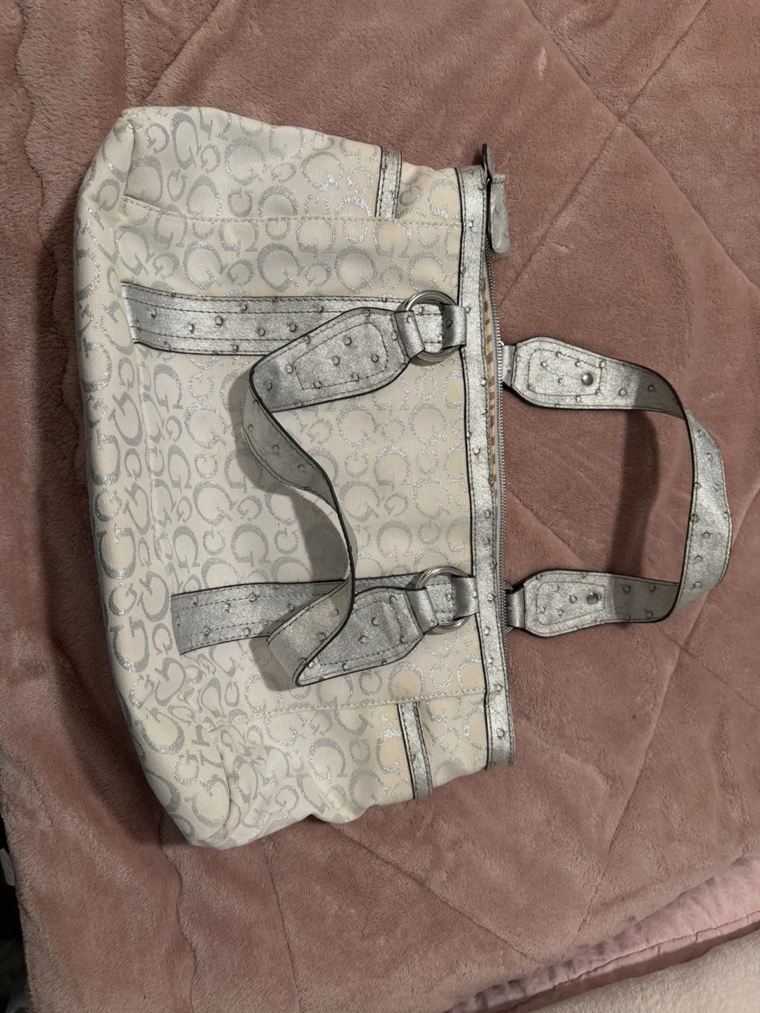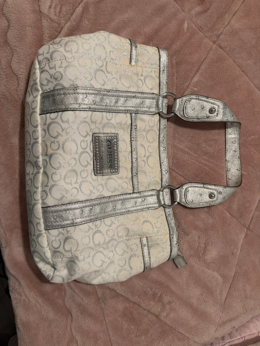 This is a Guess tote bag with a white and silver monogram pattern. It features a zebra-print interior lining and multiple pockets. Includes original dust bag.