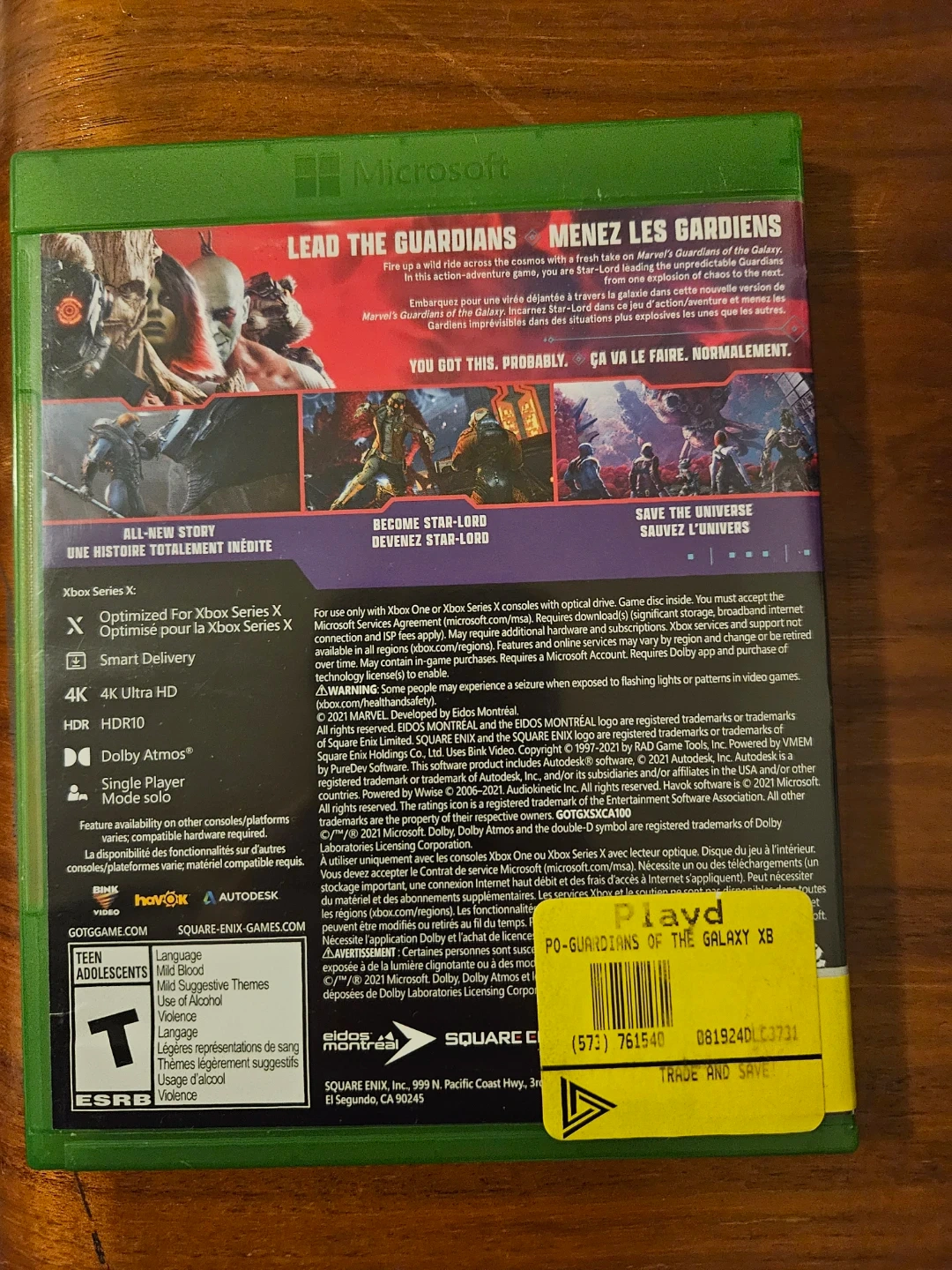 Selling Marvel's Guardians of the Galaxy for Xbox Series X and Xbox One. Enjoy this action-adventure game with a fresh take on Marvel's Guardians of the Galaxy. Rated T for Teen.