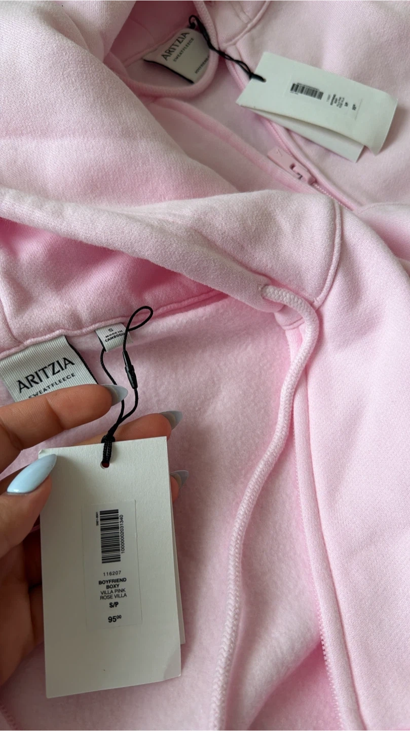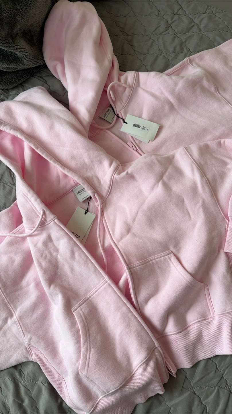 This Aritzia Boyfriend hoodie is a cozy pink colour. It's made from their Sweatfleece material and is a size small. The hoodie features a front kangaroo pocket and a zip-up closure.