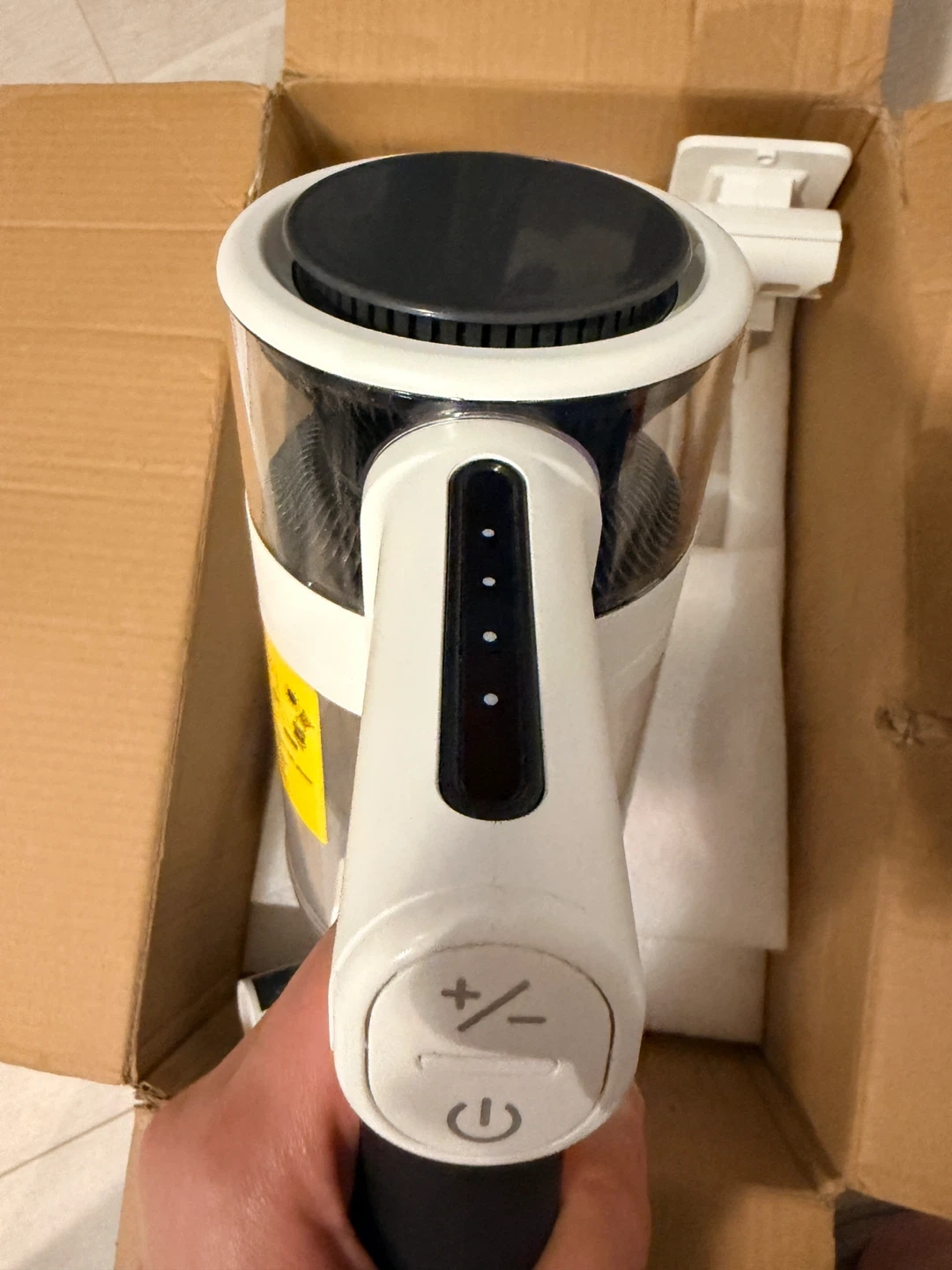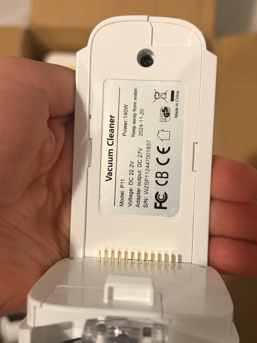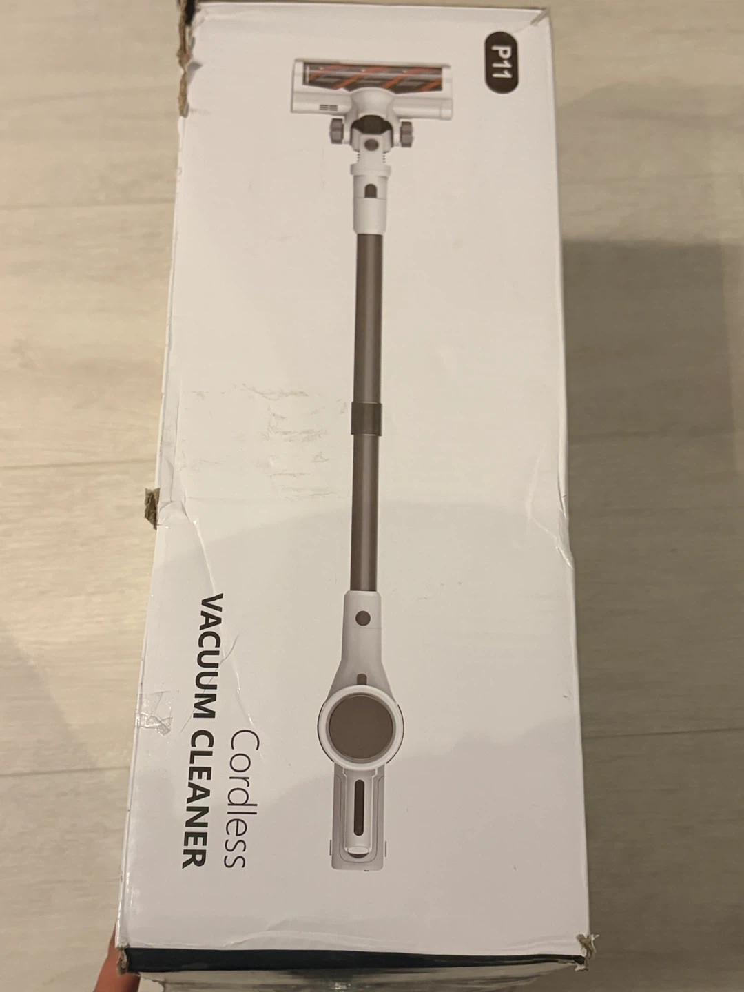 This is a cordless vacuum cleaner, model P11. It features a 140W motor and a 22.2V battery. Comes with various attachments and a charging adapter.