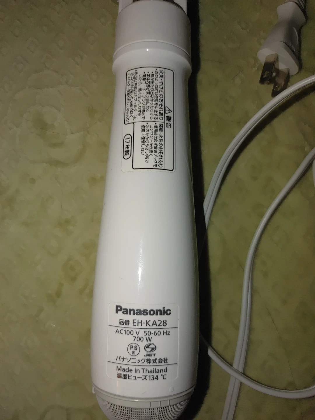 This is a Panasonic hair dryer brush, model EH-KA28. It operates at 100V, 50-60 Hz with a 700W output. It's made in Thailand. This tool's brush attachment helps style hair while drying.