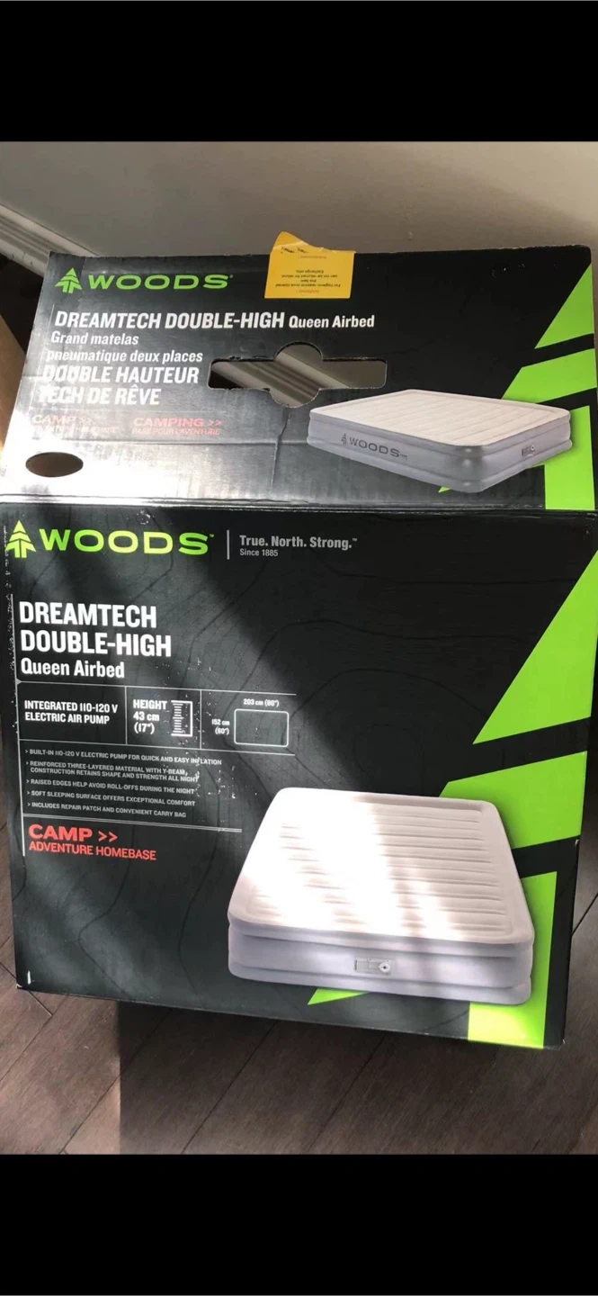 Woods Dreamtech Double-High Queen Air Mattress with integrated electric pump. It features three-layer construction for durability and comfort. Built-in pump inflates the mattress in minutes.