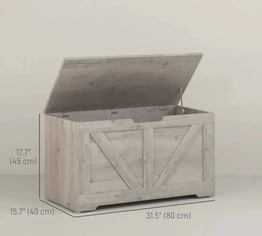 HOMCOM Storage Chest, Storage Bench with 2 Safety Hinges. Dimensions: 31.5" (L) x 15.7" (W) x 17.7" (H). Supports up to 300 lbs. Grey wood grain finish.