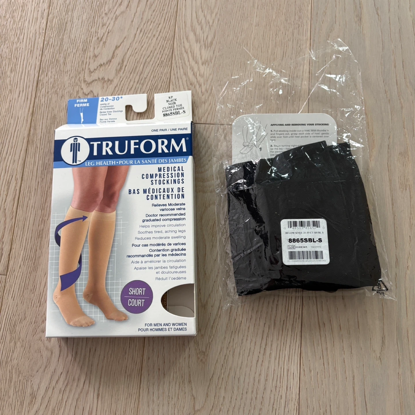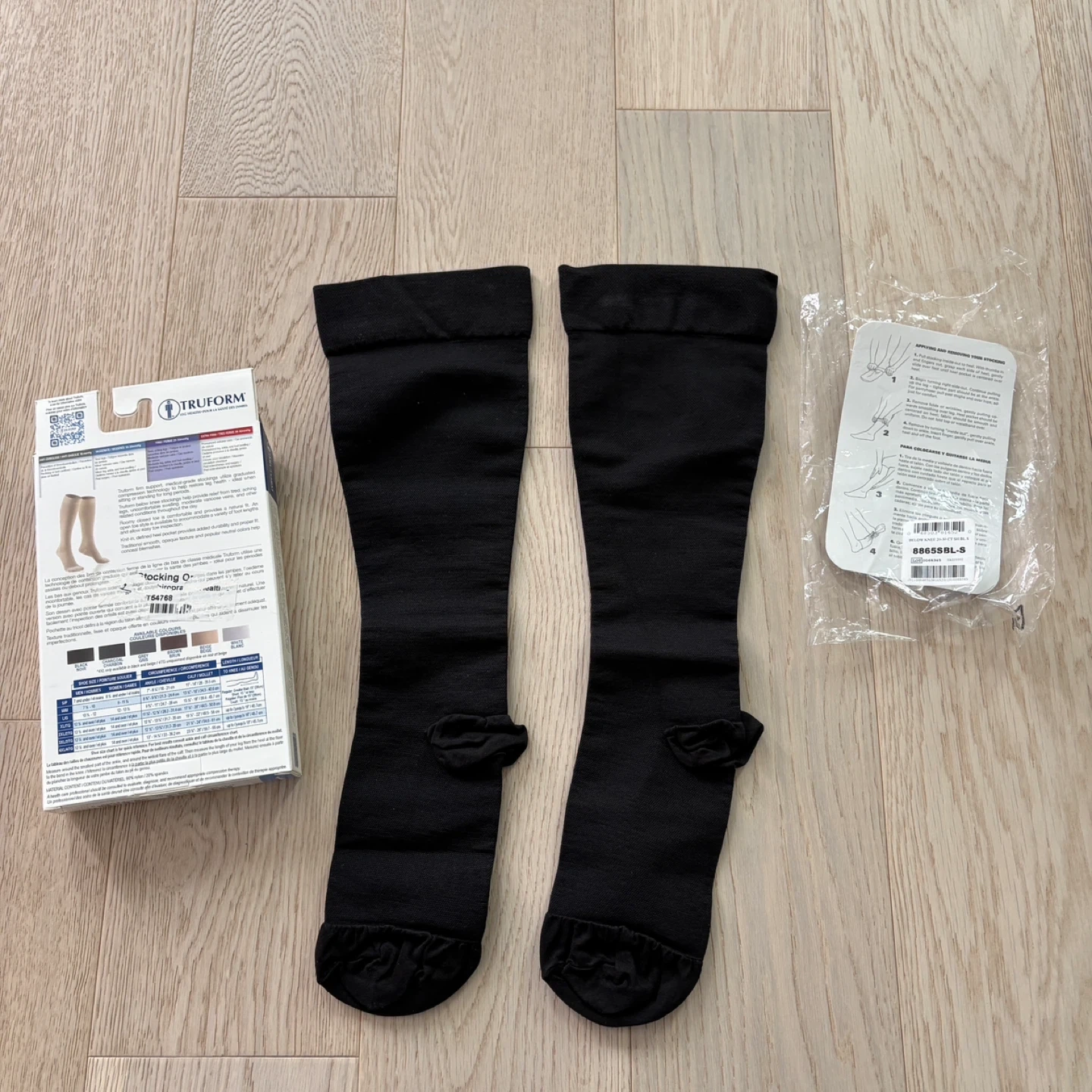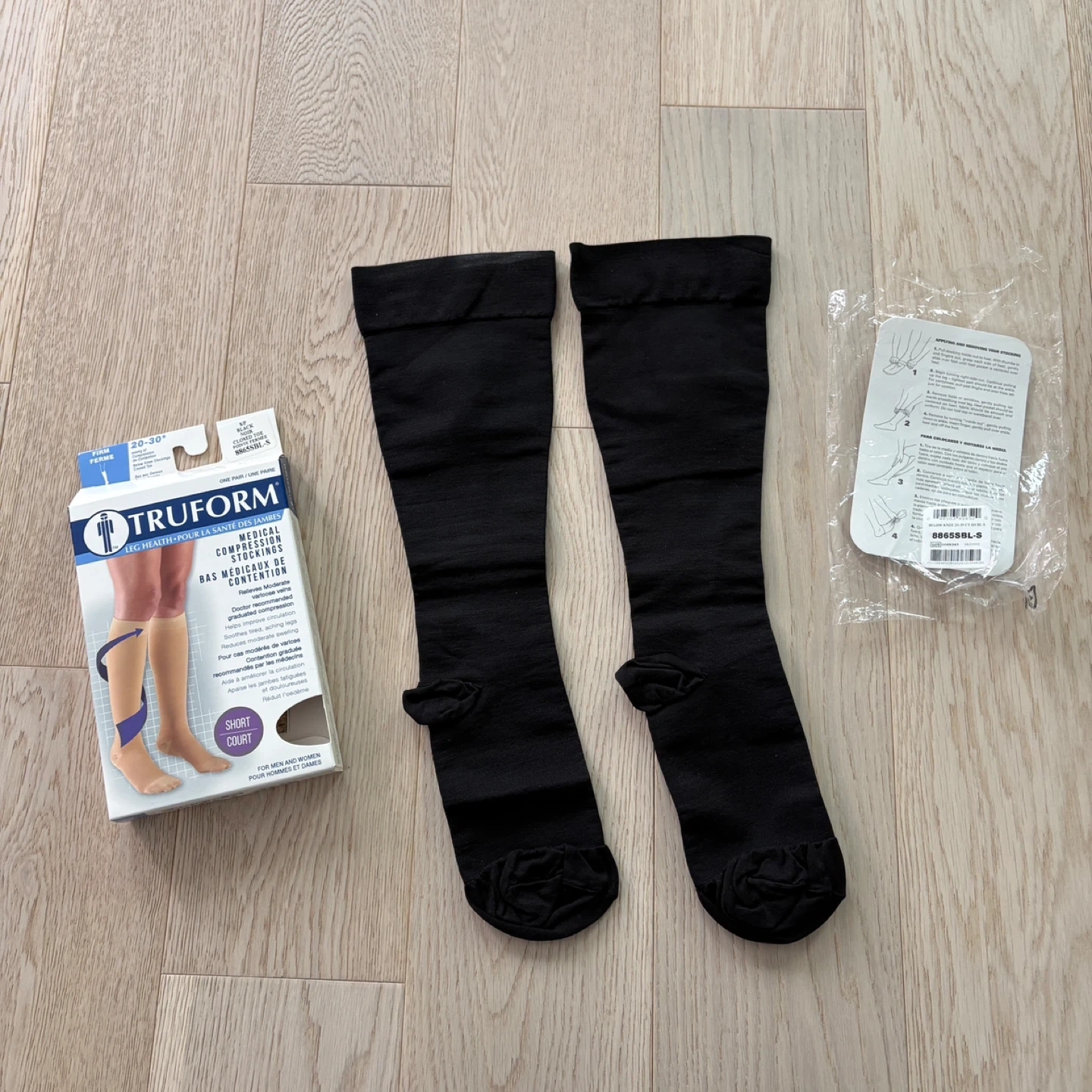 Truform medical compression stockings in black, size small, short style. These graduated compression stockings help relieve moderate varicose veins & swelling. Open box only, never worn, so labelled as “like new”.