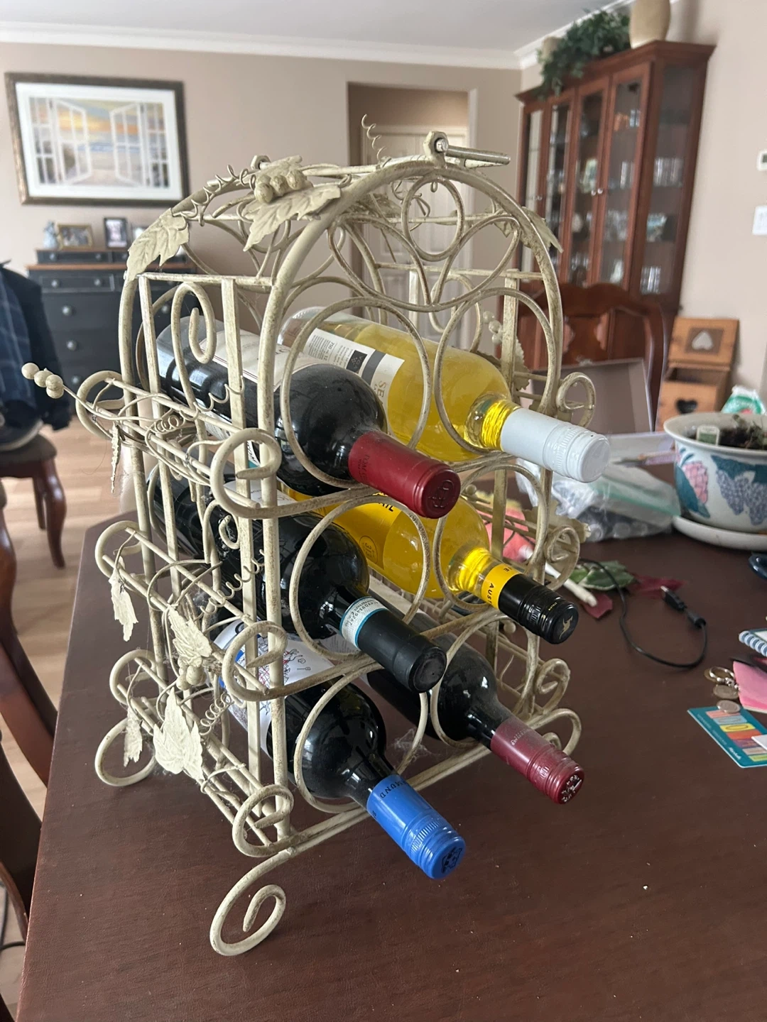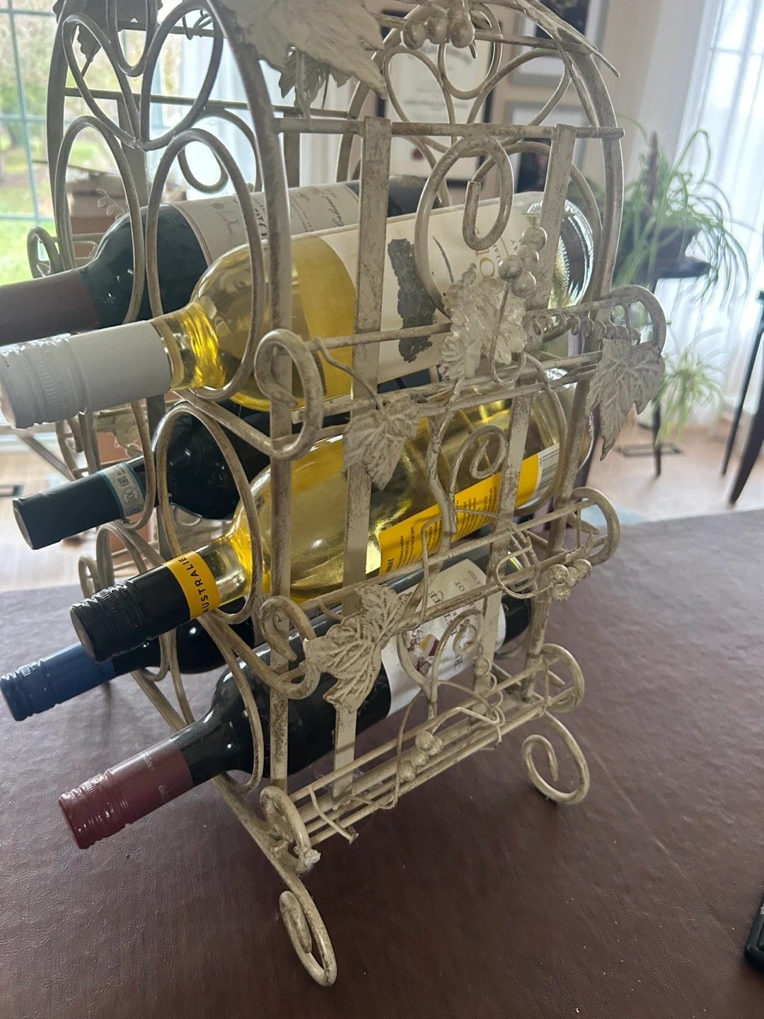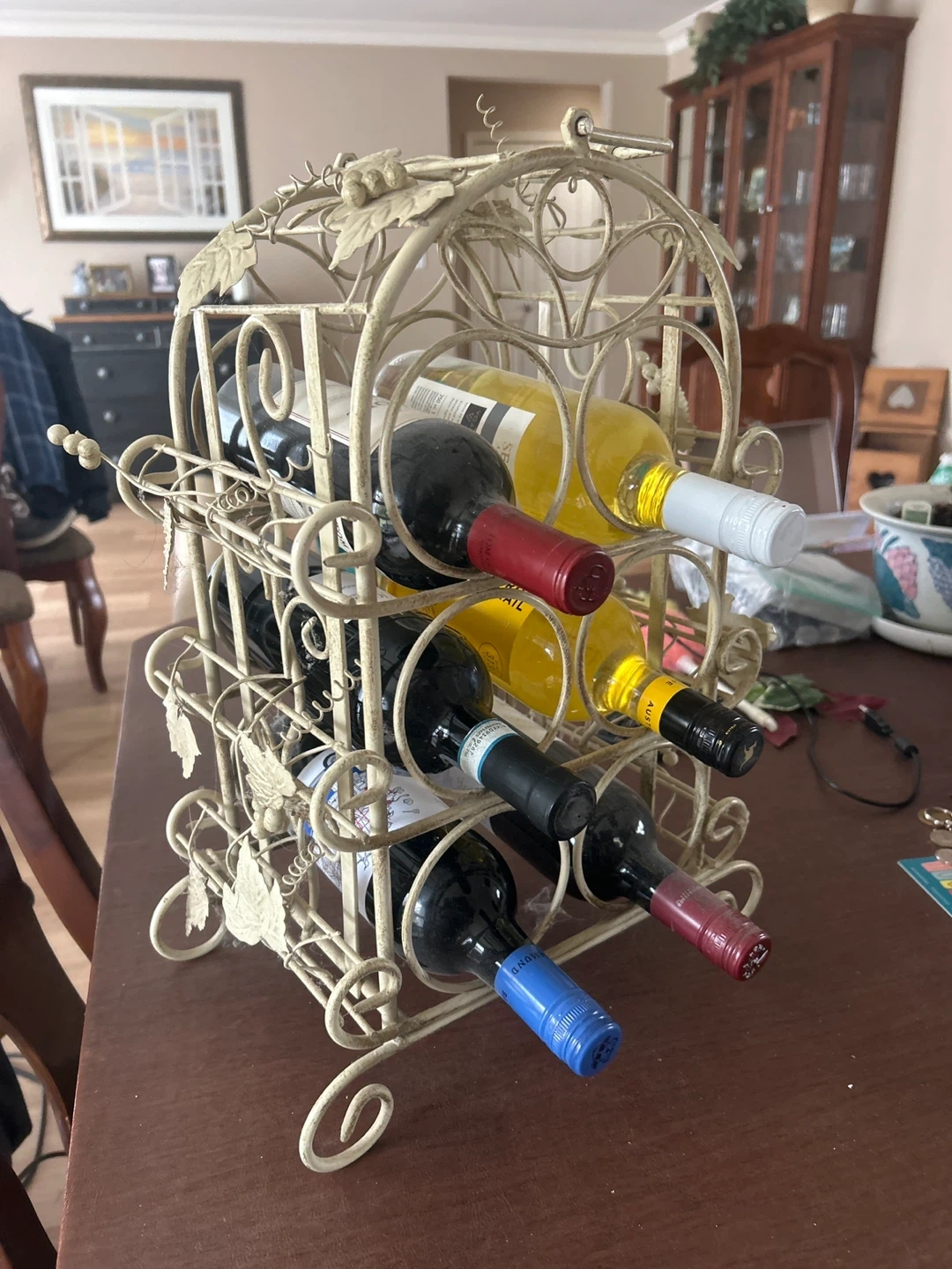 This decorative metal wine rack holds six bottles. It's finished in an antique cream colour with a charming vine and leaf design. It's perfect for a kitchen or dining room.
