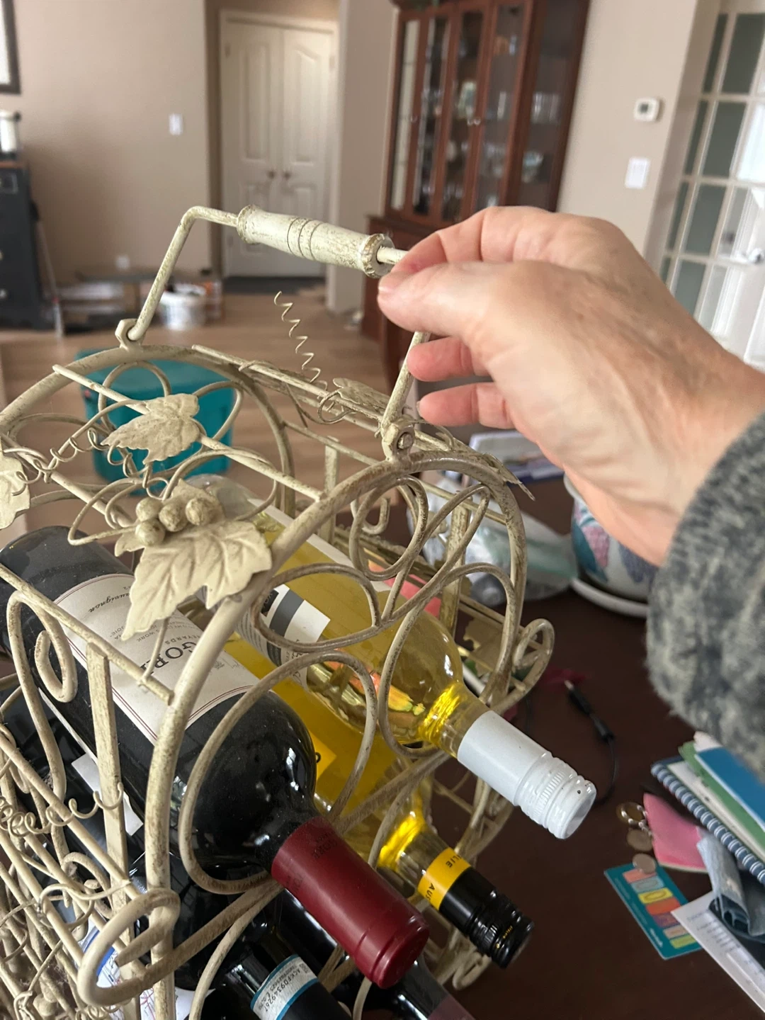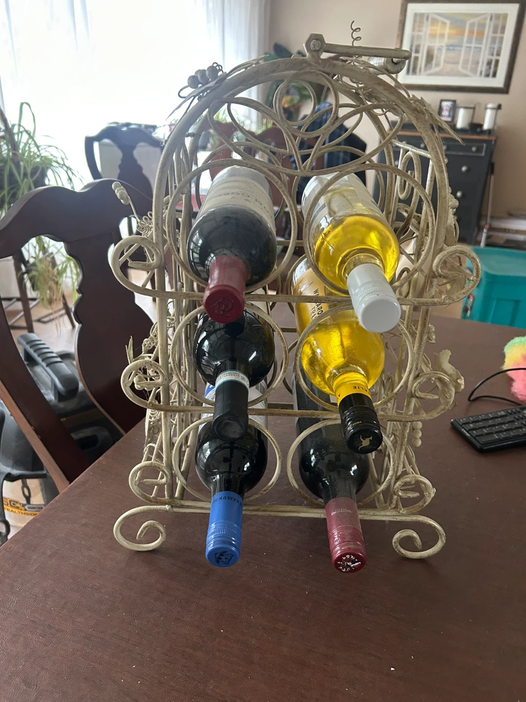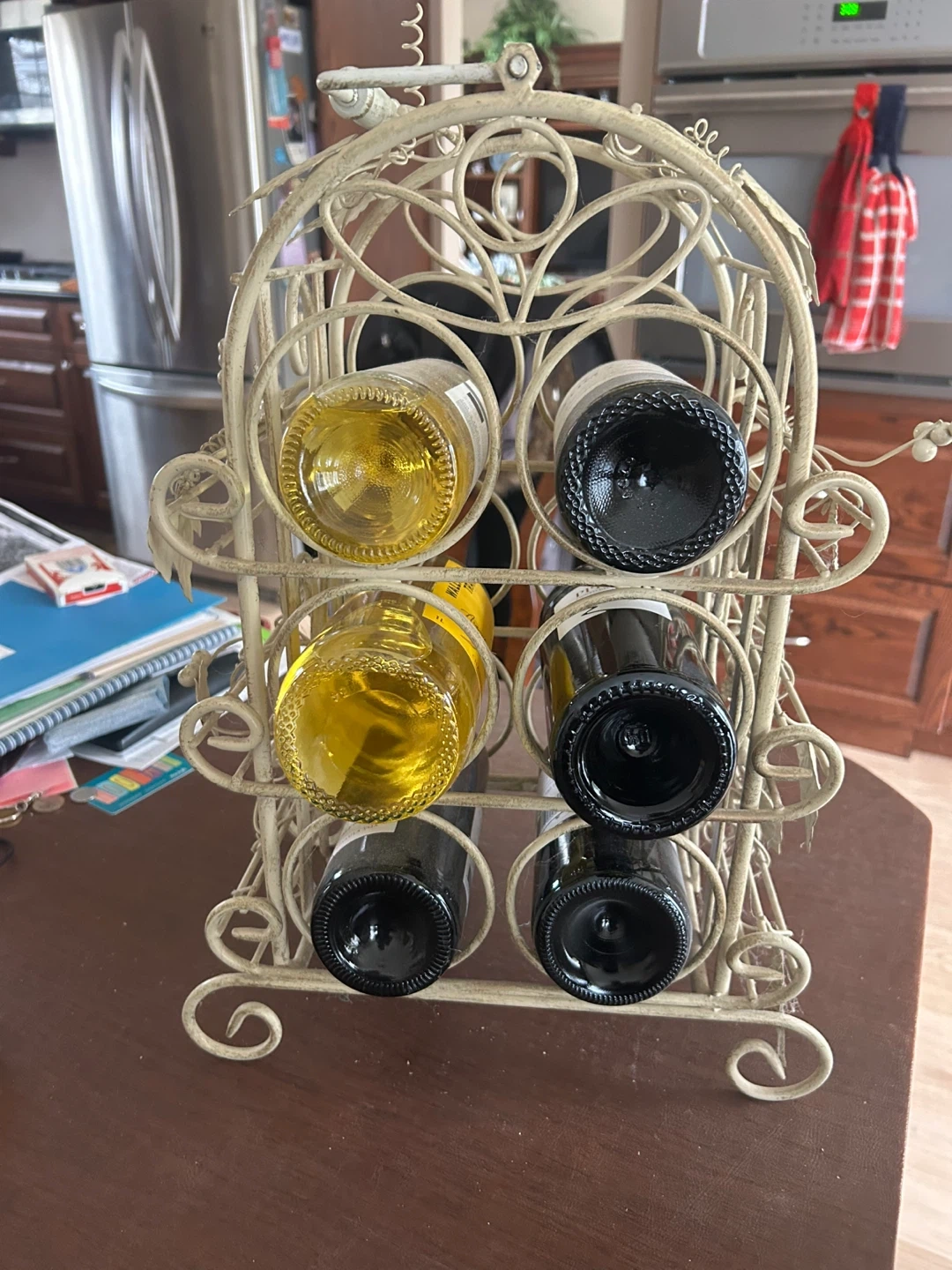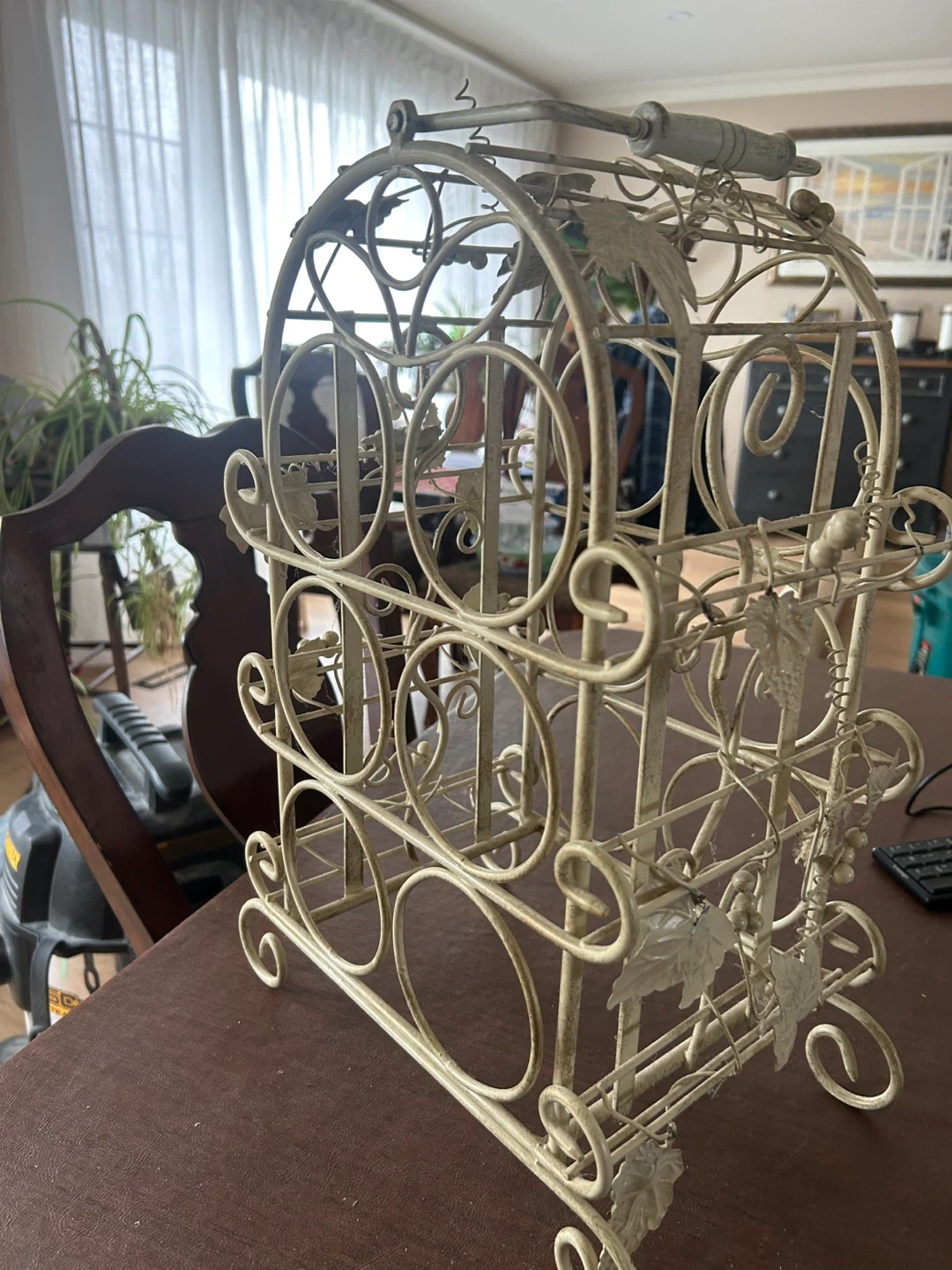 This decorative metal wine rack holds six bottles. It's finished in an antique cream colour with a charming vine and leaf design. It's perfect for a kitchen or dining room.