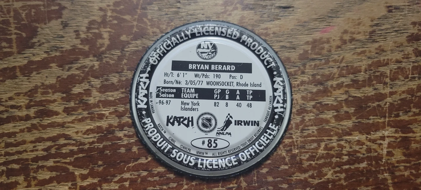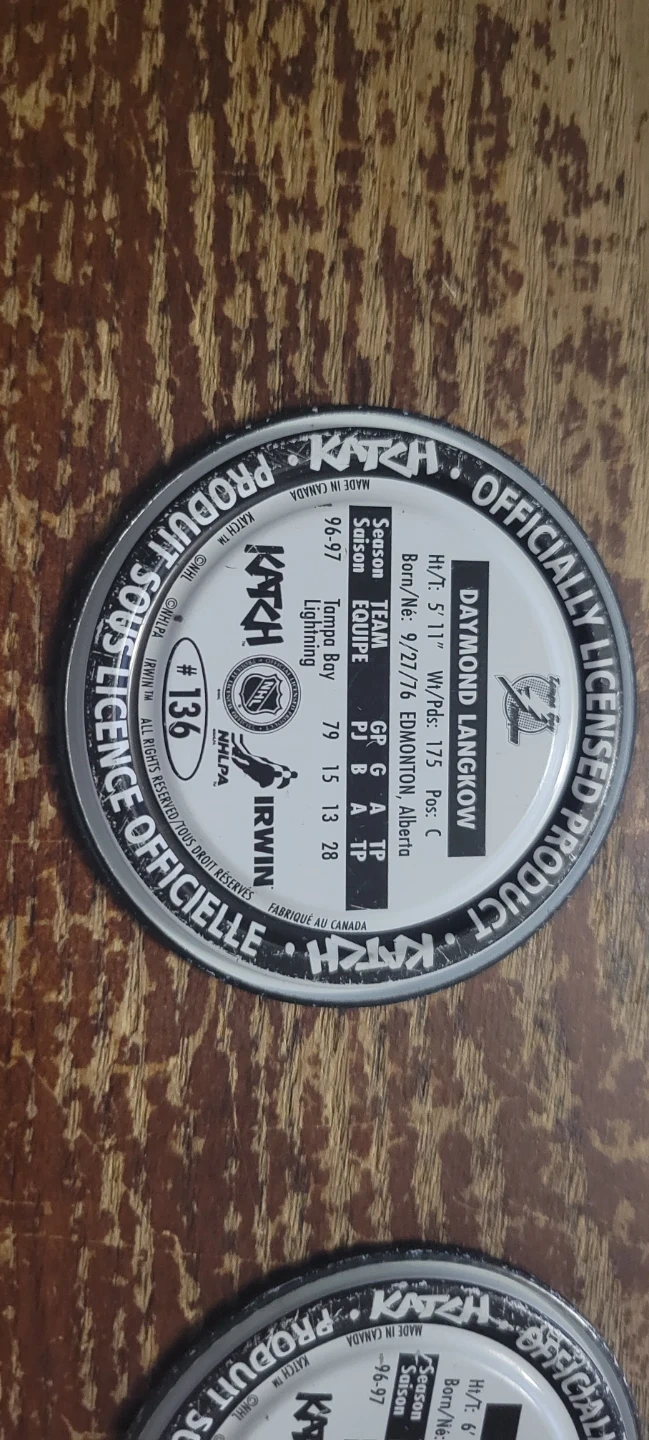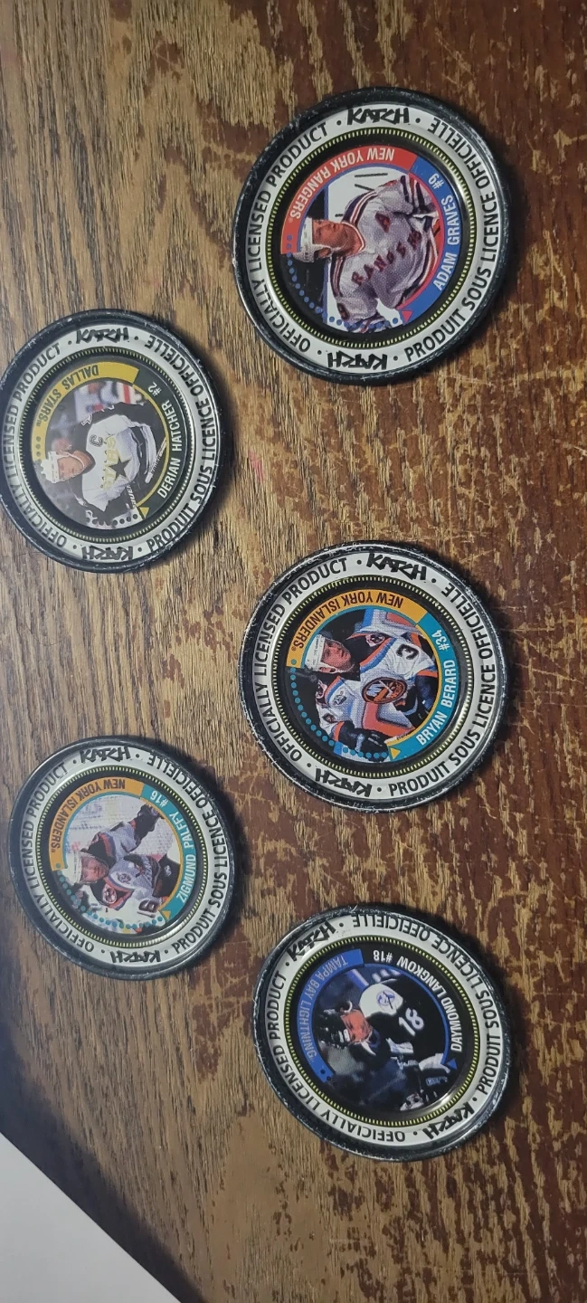 This is a collection of five Katch NHL hockey pucks. Each puck features a different player with their stats from the 96-97 season. The players featured are Daymond Langkow, Adam Graves, Bryan Berard, Derian Hatcher, and another player whose name isn't fully legible in the images. These are officially licensed products made in Canada.