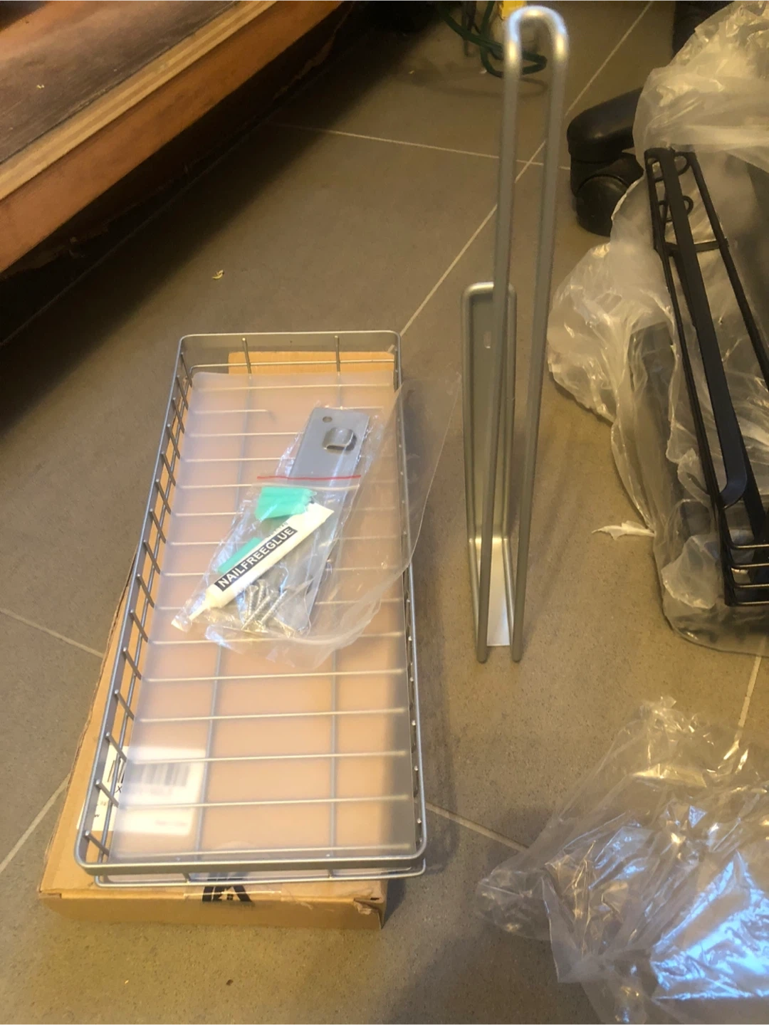 This wire storage basket comes with nail-free glue for easy mounting. It's made of durable metal wire. It's great for organizing small items in kitchens or bathrooms!