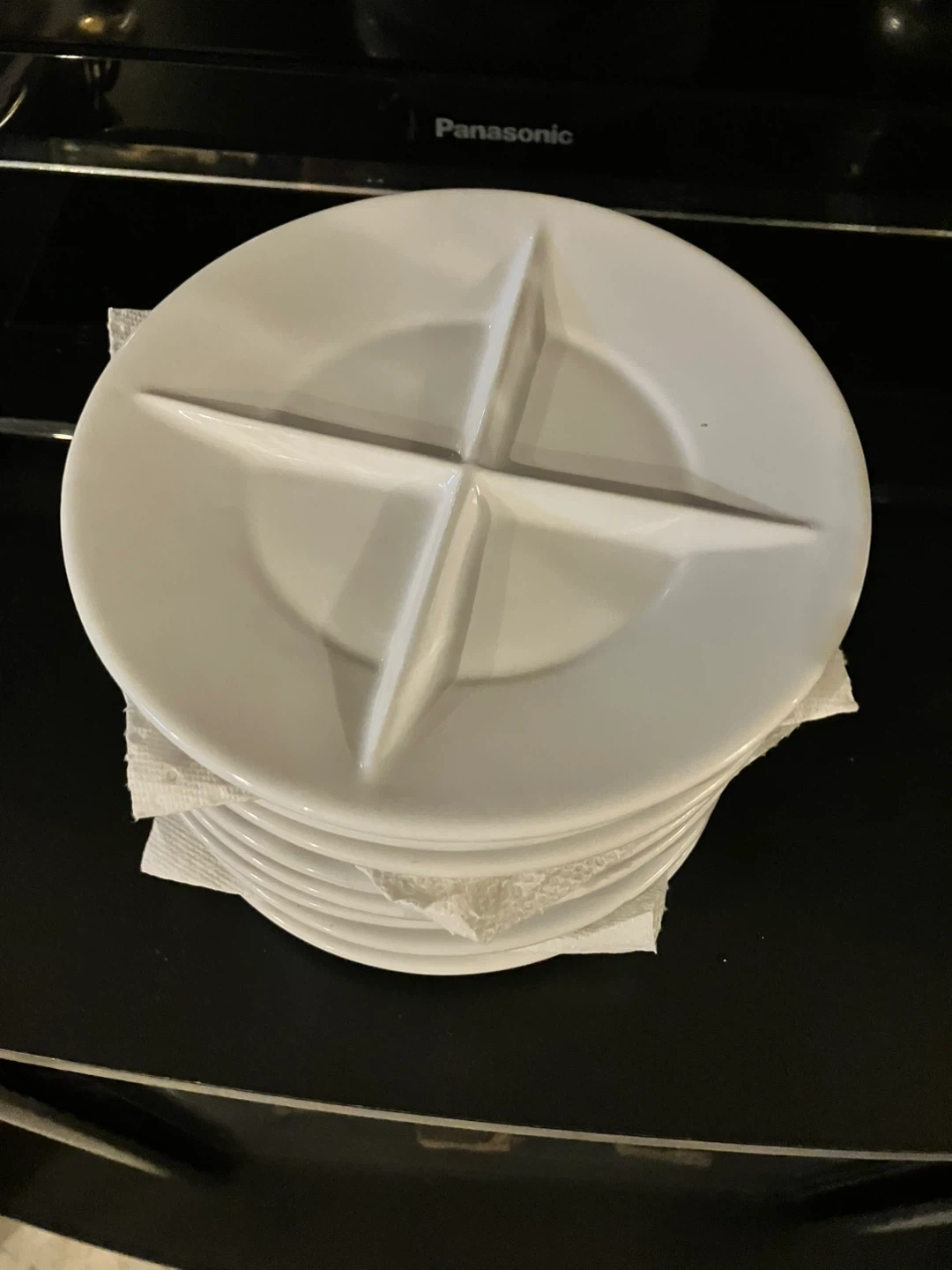 Set of 8 white ceramic divided plates. Each plate has four sections for serving different foods. Dishwasher safe for easy cleanup! Brand new