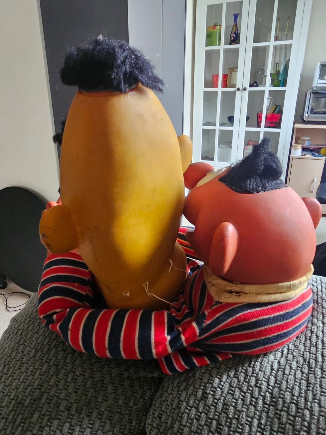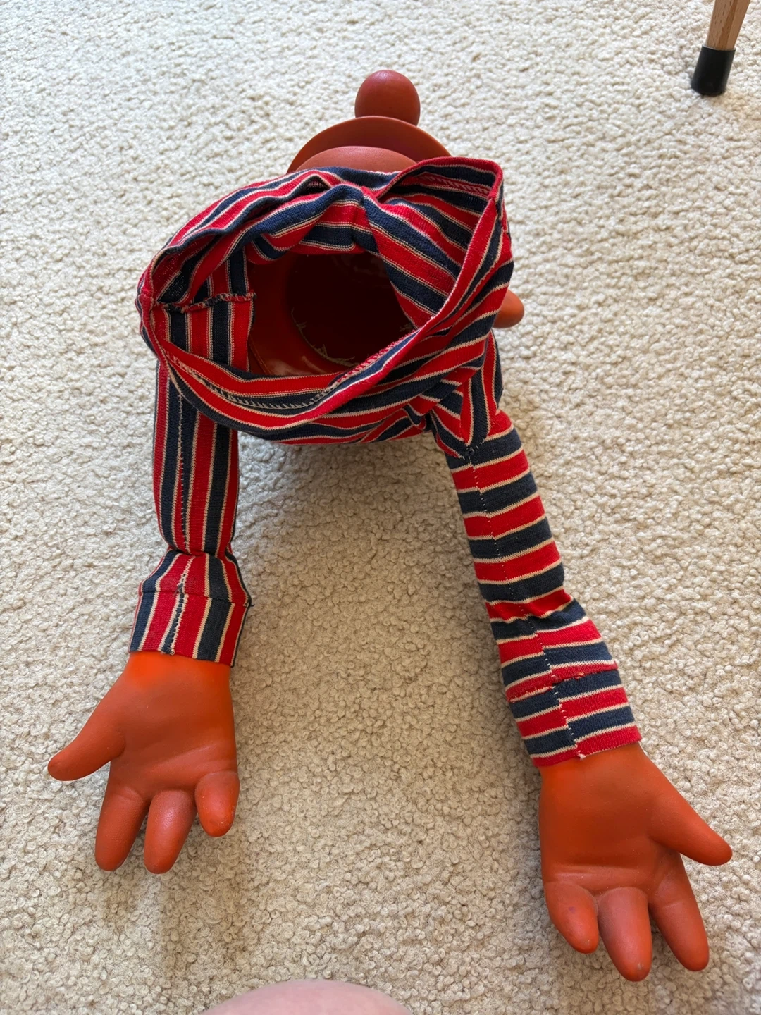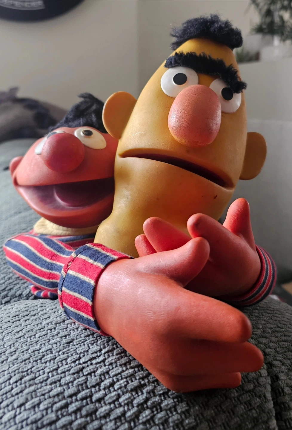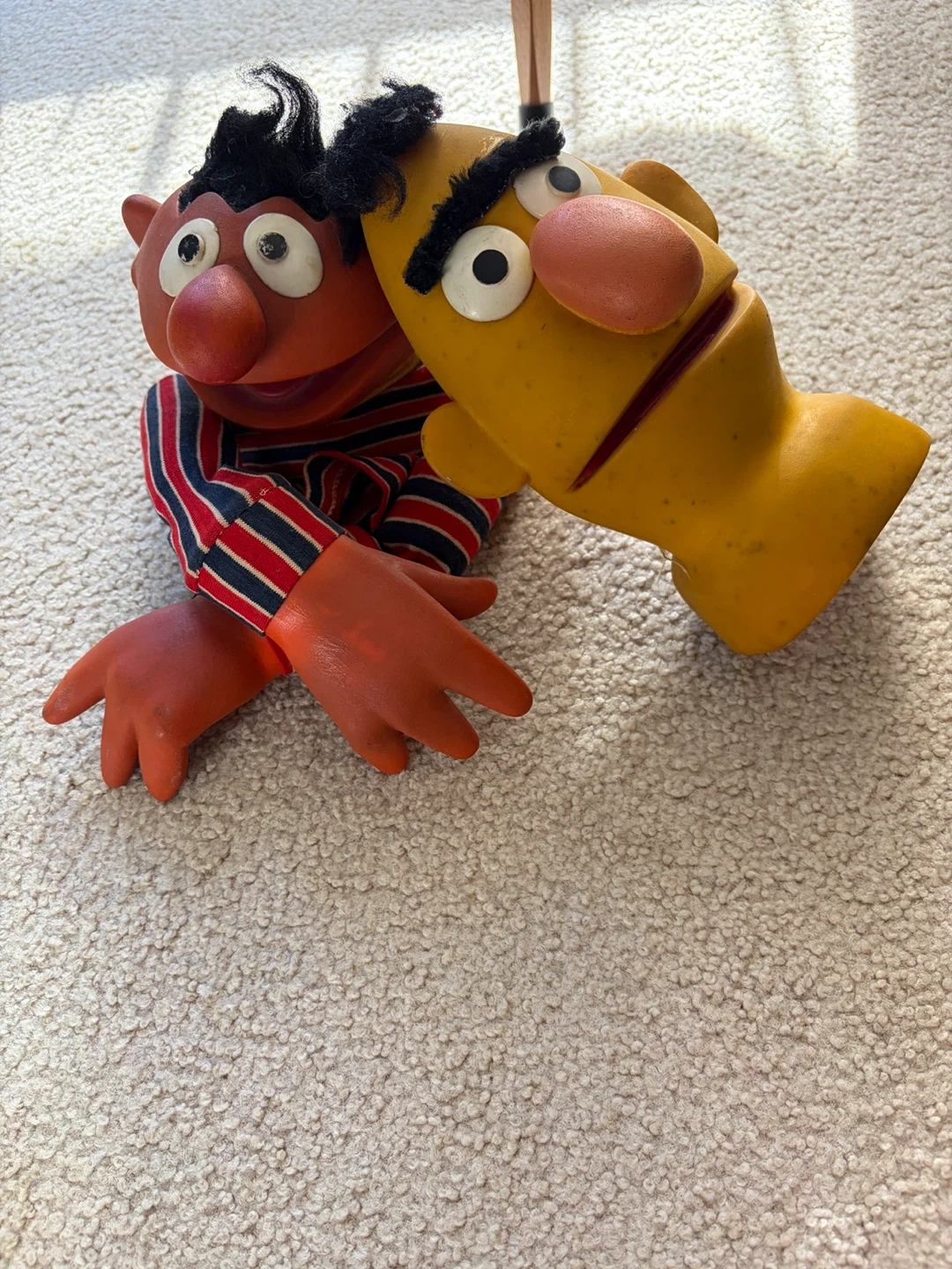 Classic Bert and Ernie hand puppets with their iconic striped shirts. Features vinyl heads and fabric bodies. These puppets are great for interactive play and storytelling!
