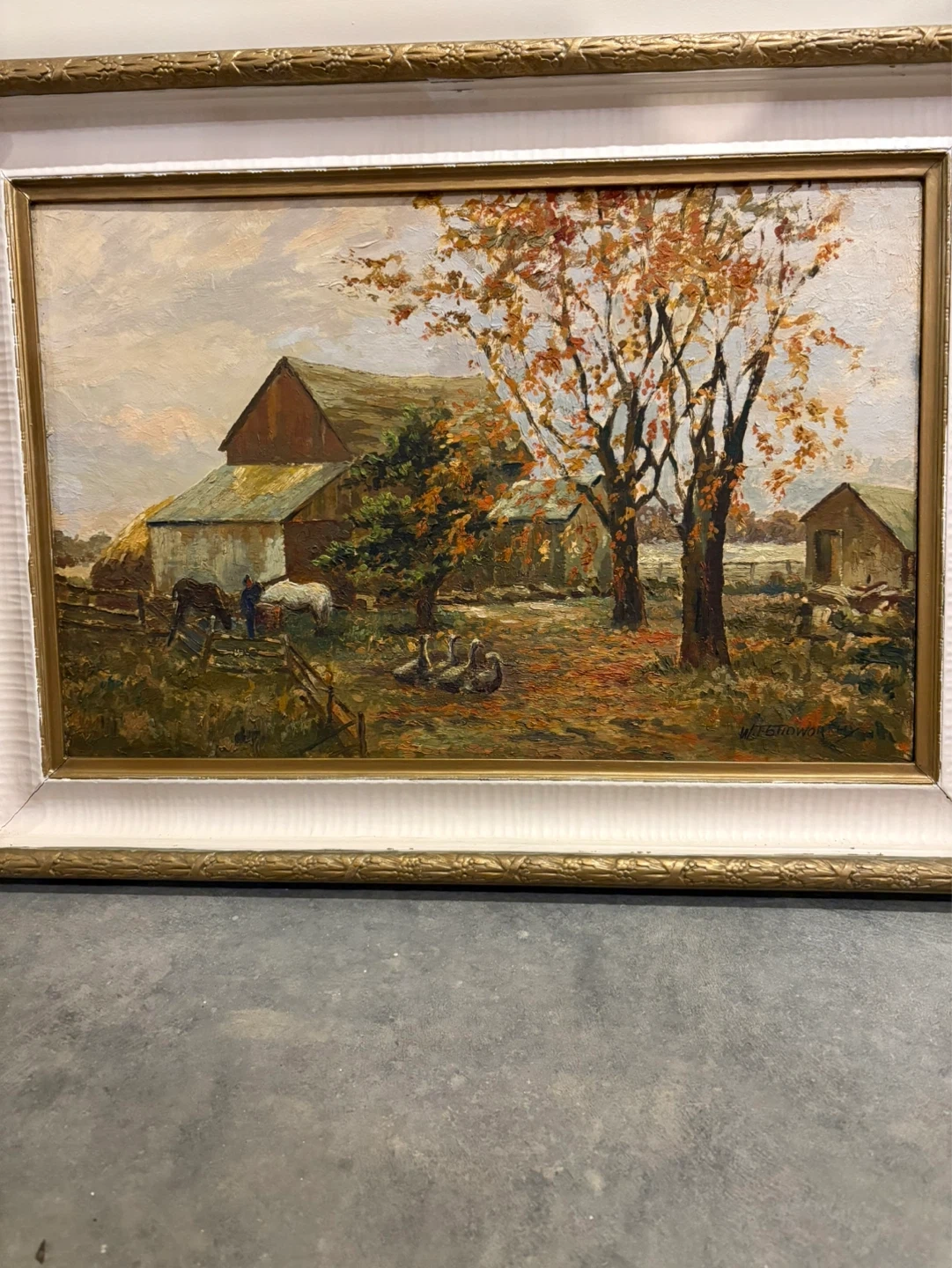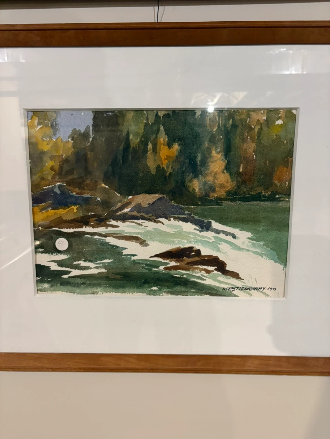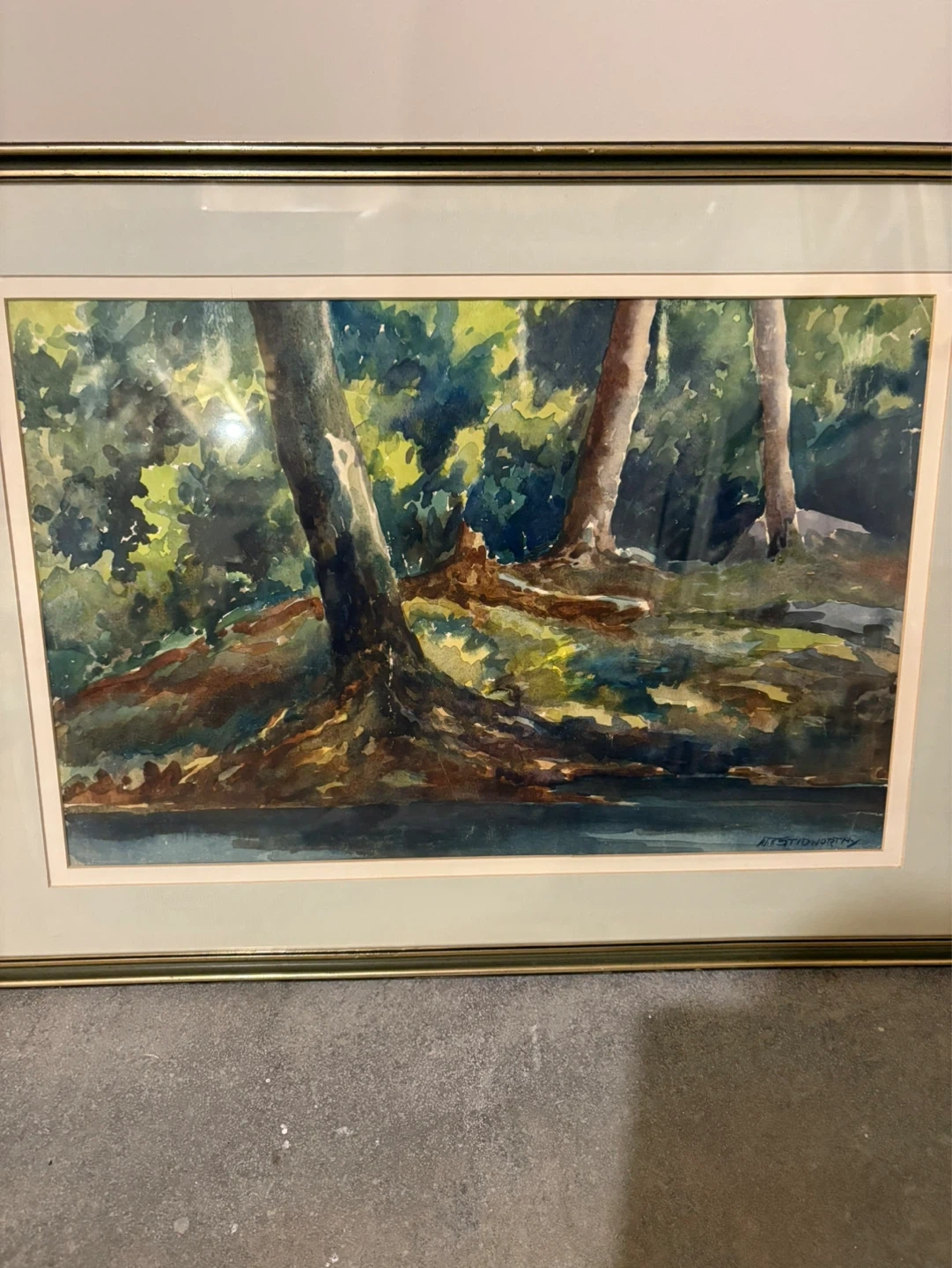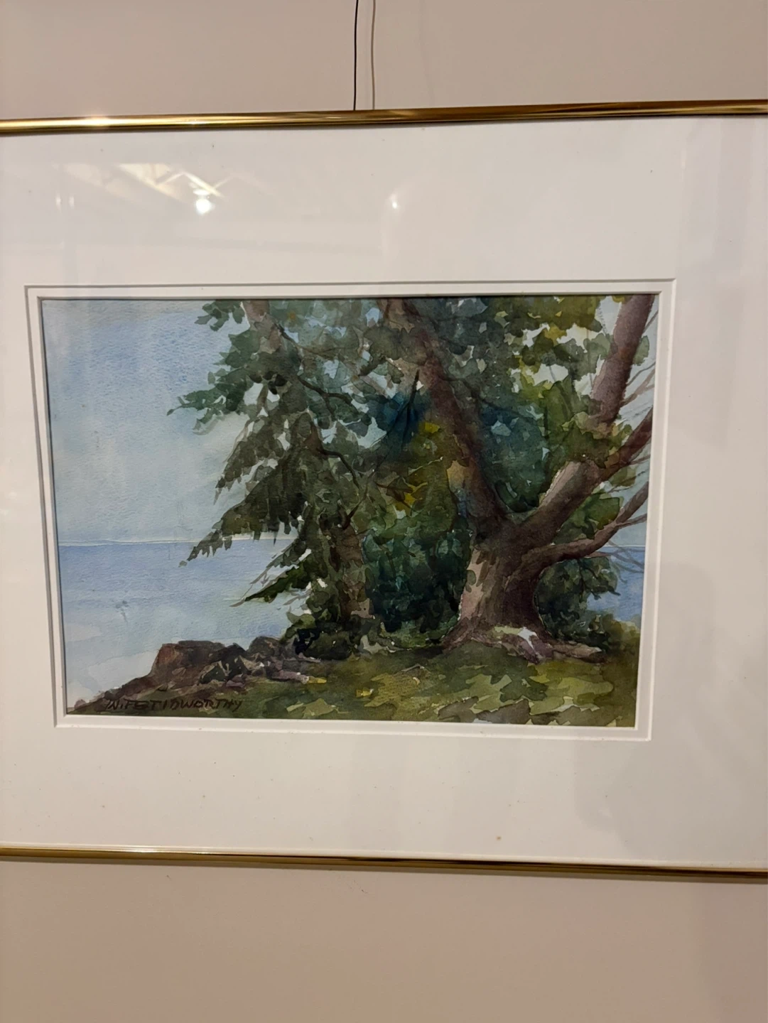 This is a framed watercolour painting depicting a serene coastal landscape. It showcases a tree-lined shore under a clear sky. The artwork is framed in gold.