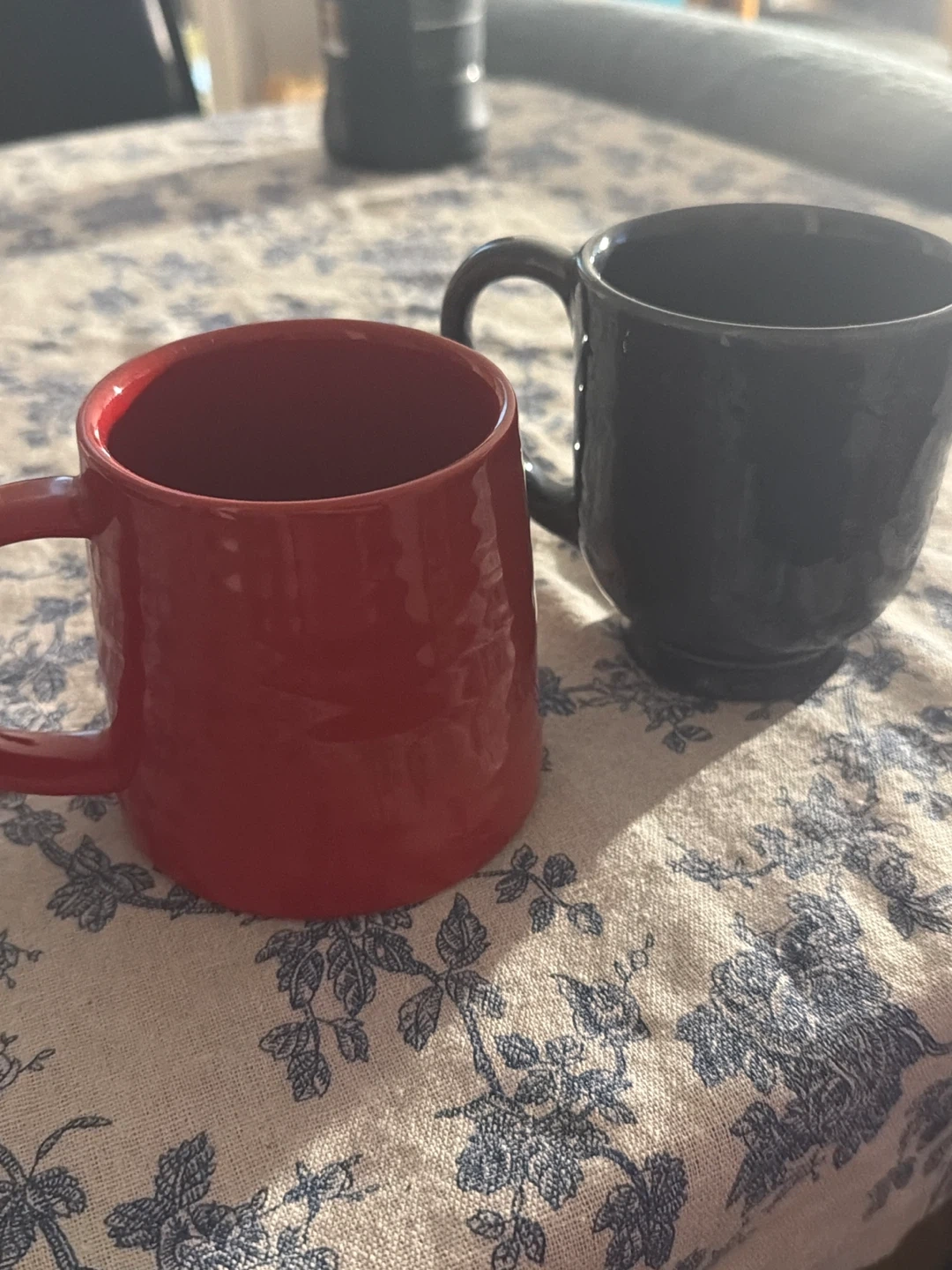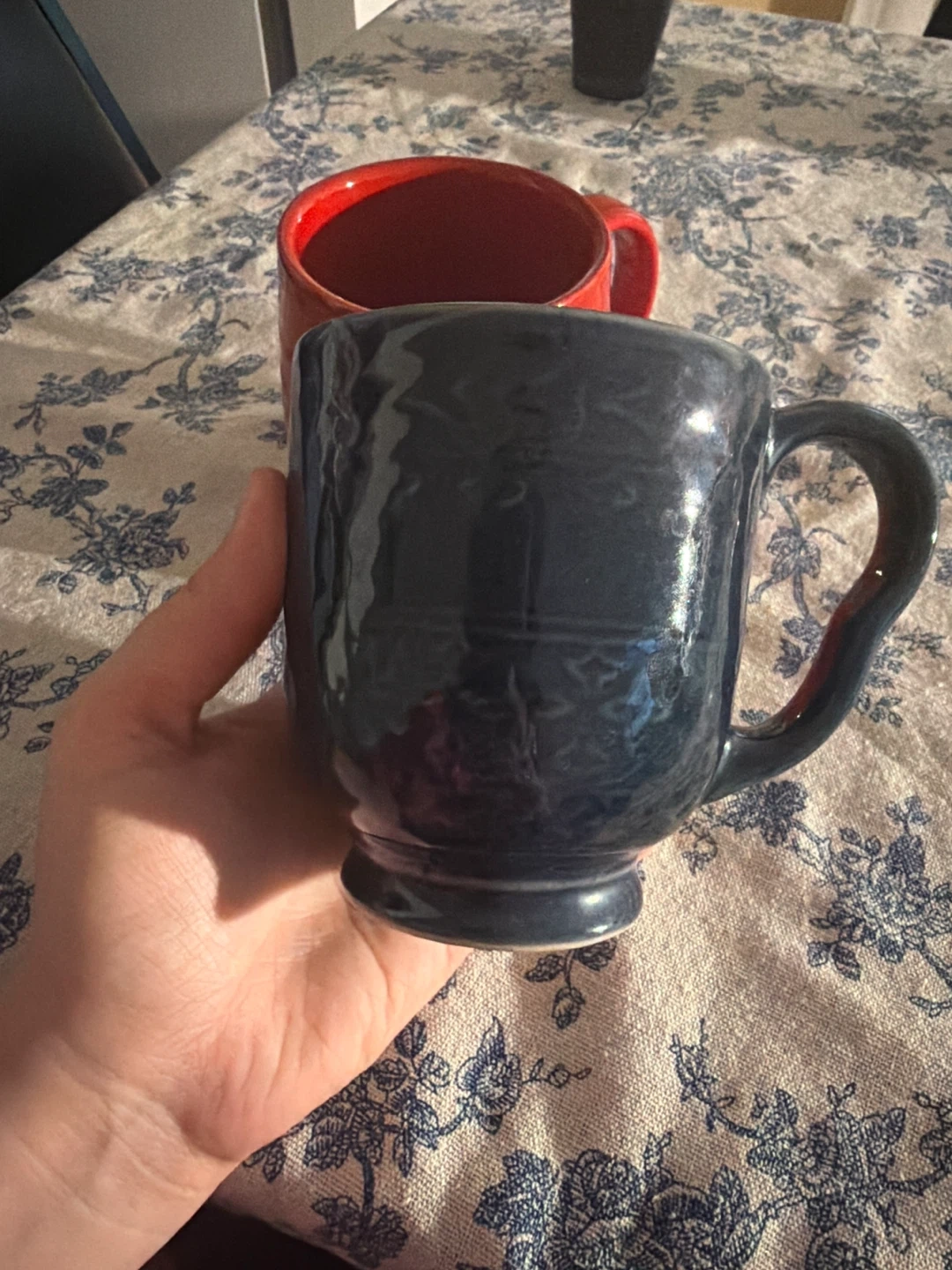 Two ceramic mugs, one red and one dark blue. Sturdy construction and comfortable handles. Perfect for your morning coffee or tea!