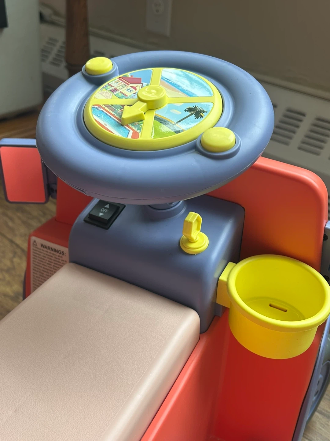 BRAND NEW! Only a few weeks old! This Bluey ride-on car features a colorful steering wheel and character decals. It's perfect for little ones who love imaginative play. The ride-on is made of durable plastic and includes a cup holder.