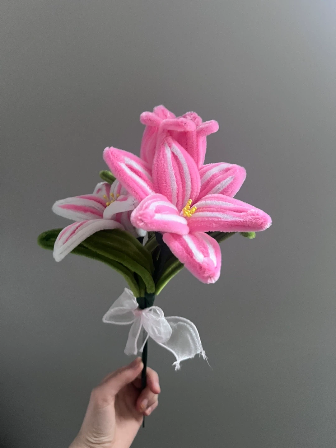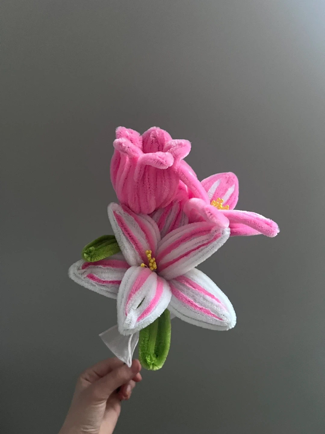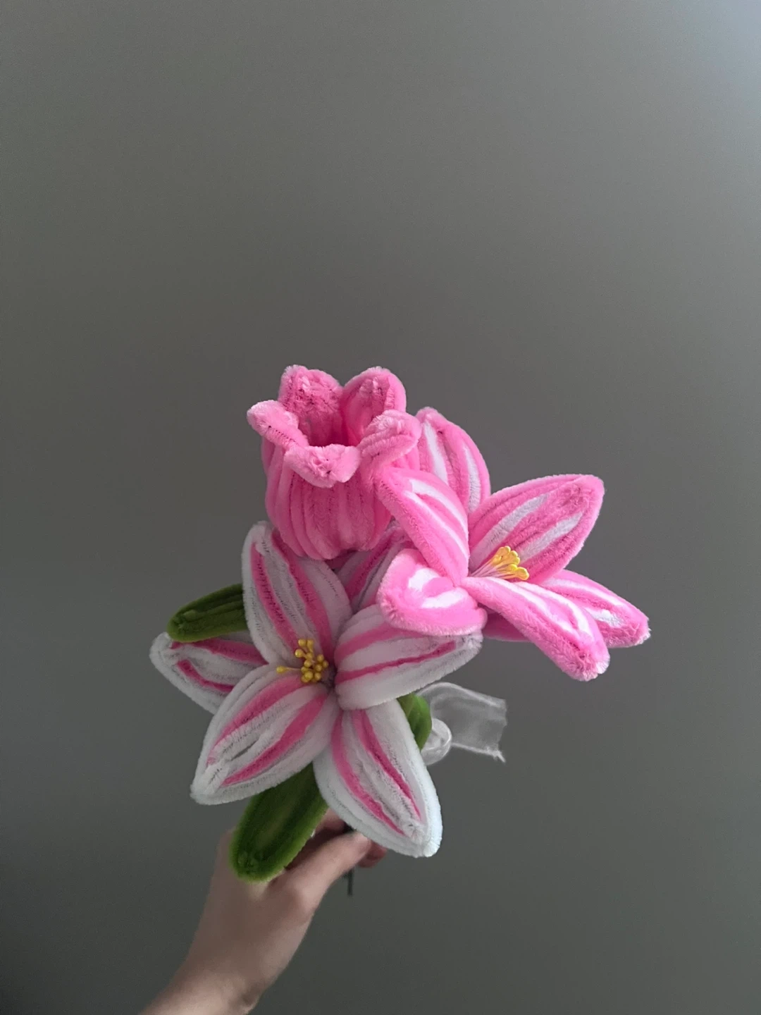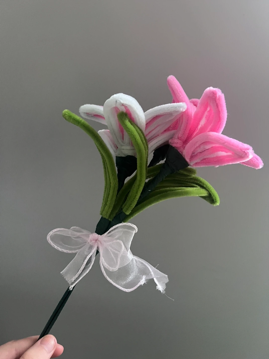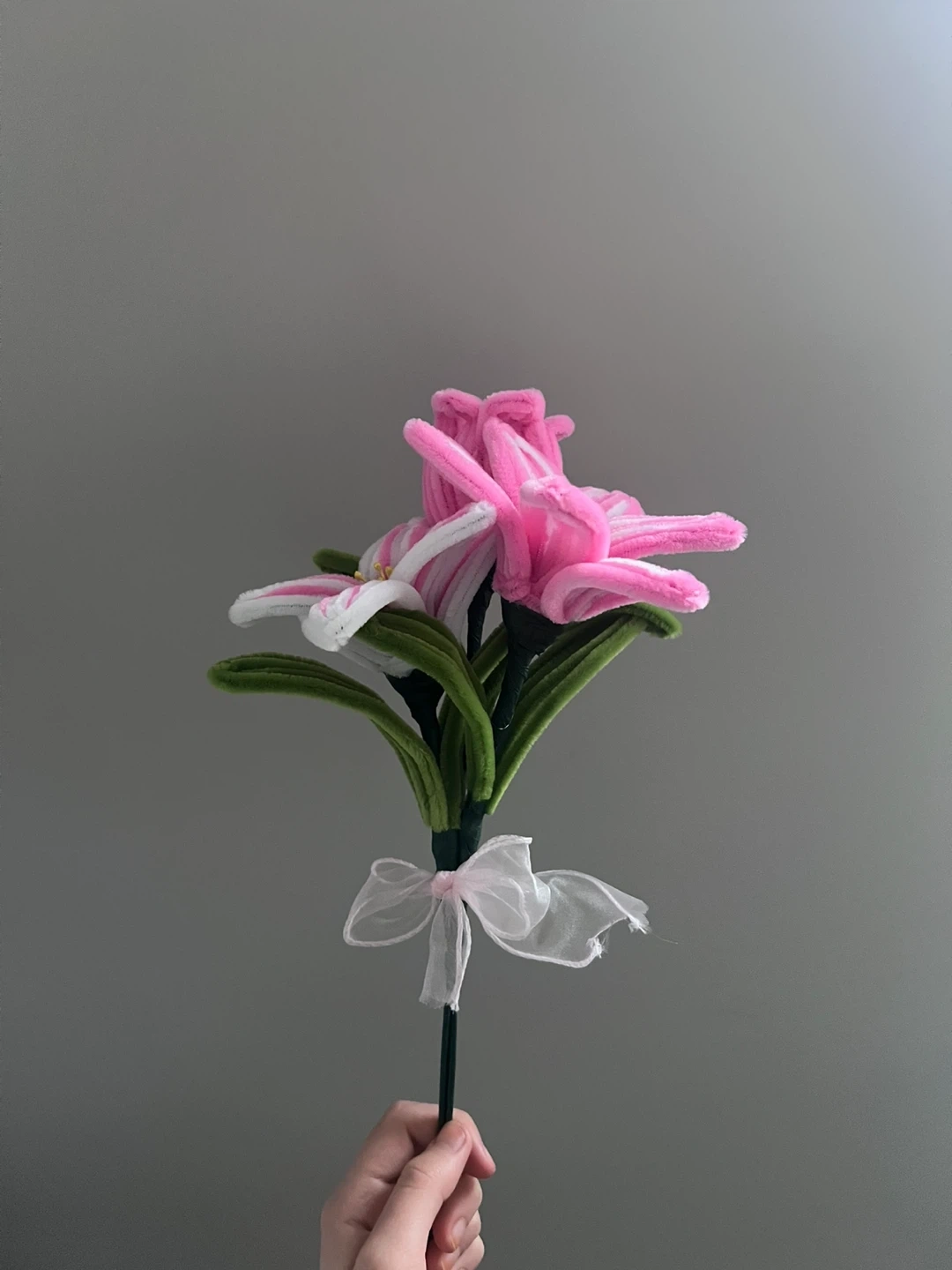 Bring your mother this nice gift - A bouquet of pipe cleaner flowers in pink and white. It's tied with a sheer white ribbon. These artificial blooms are great for decoration!