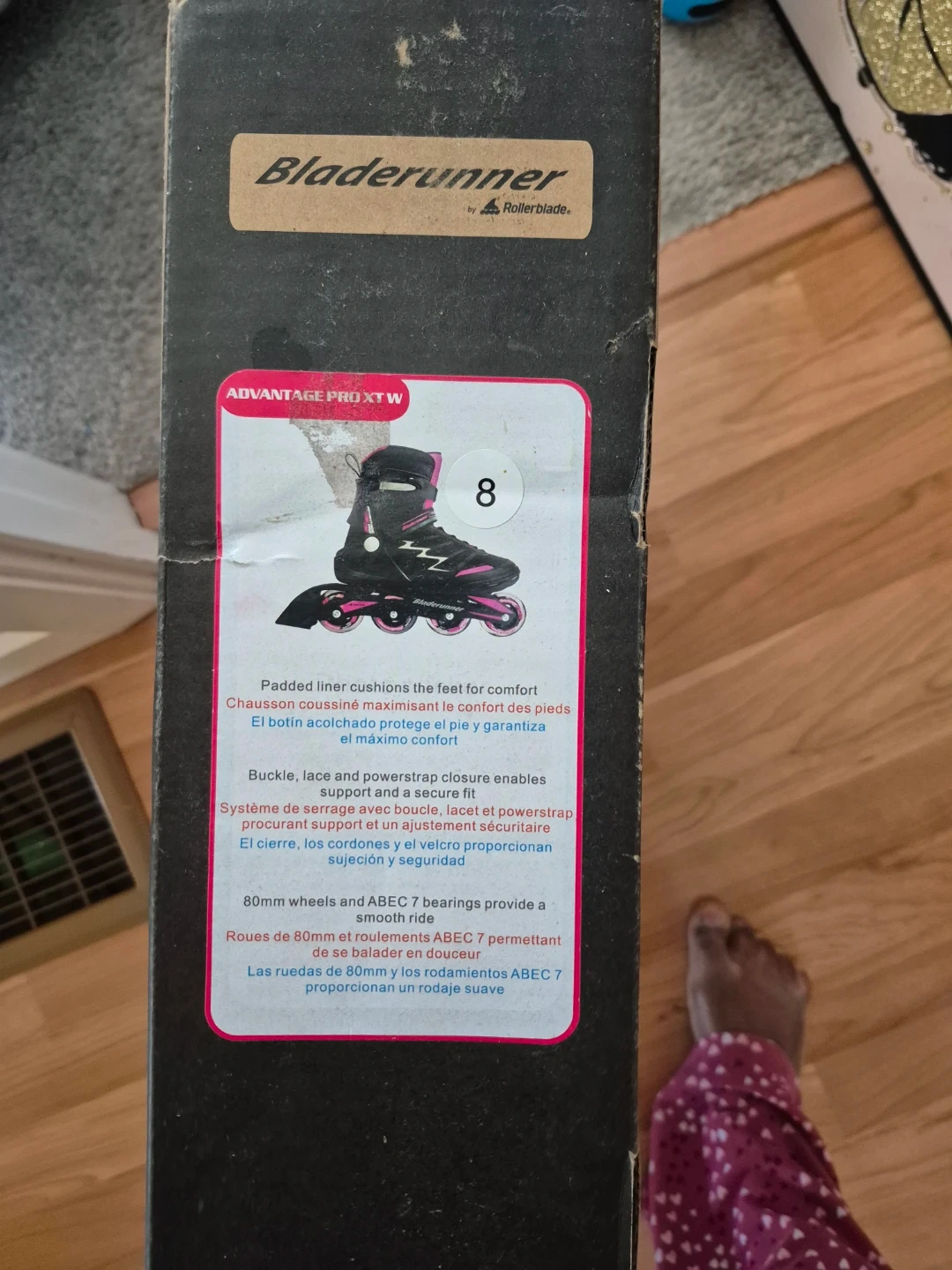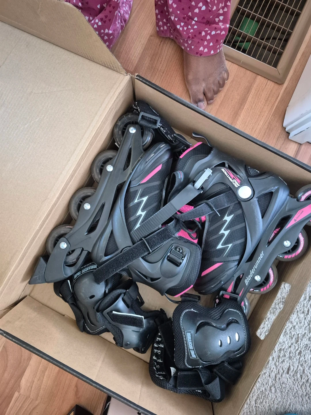 This set includes a pair of black and pink BladeRunner inline skates along with protective gear for wrists, elbows, and knees. They are designed for an adjustable fit. Great for learning to skate!