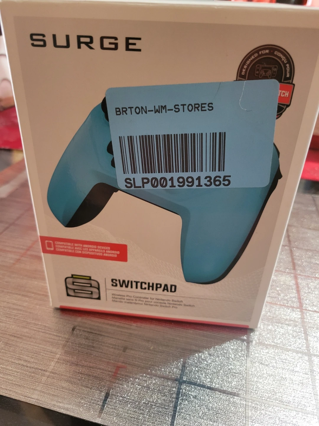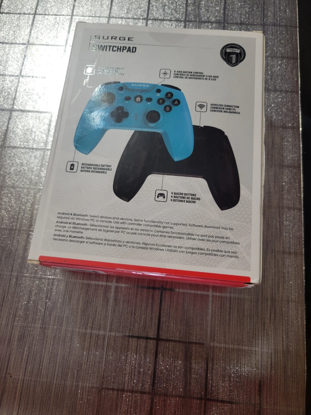 This is a Surge SwitchPad Wireless Pro Controller designed for Nintendo Switch. It's blue and compatible with Android devices. It features a rechargeable battery and 4 macro buttons.