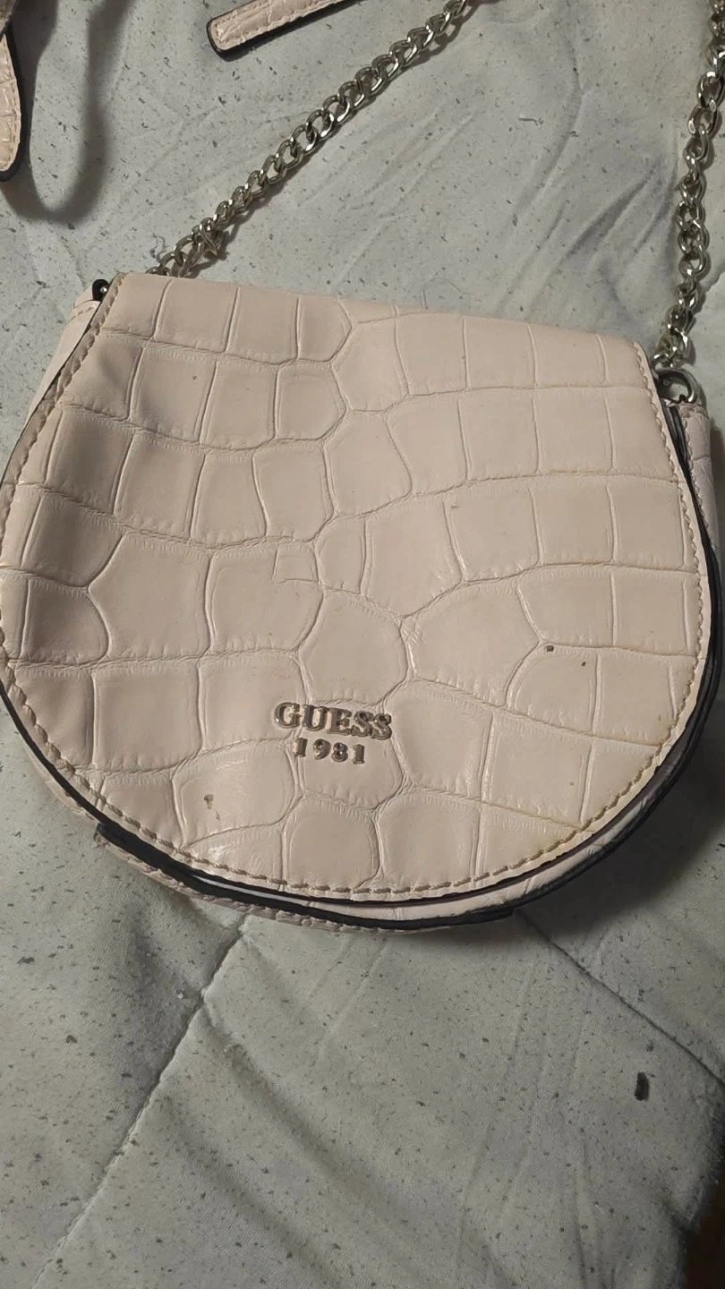 This is a pink Guess 1981 crossbody bag with a crocodile embossed pattern. It features a silver chain strap and a classic flap closure. This stylish accessory adds a touch of sophistication to any outfit.