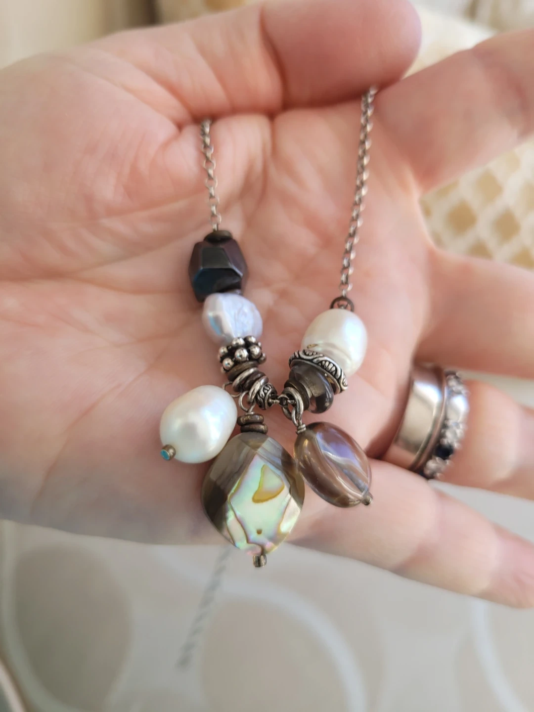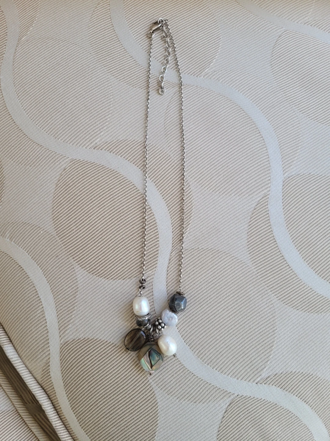 This retired Silpada necklace features a String Silver chain with a cluster of mixed beads. It includes freshwater pearls, smoky quartz, abalone shell, and hematite stones etc.