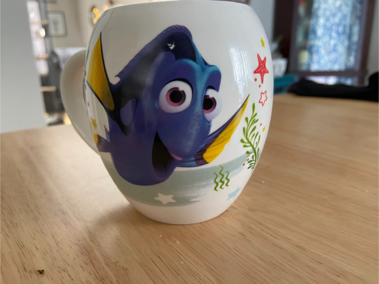 White ceramic mug featuring characters from Finding Nemo and Finding Dory, including Dory and Nemo. It's got fun underwater graphics. This mug is perfect for enjoying your morning coffee or tea!