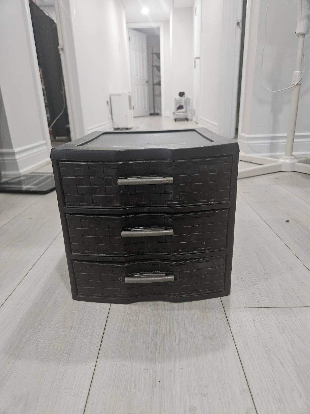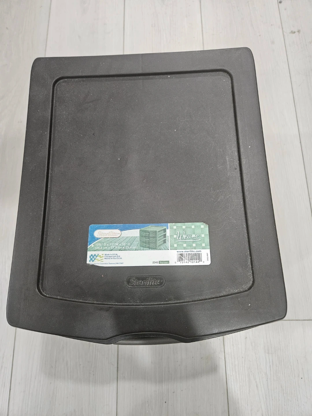 A handy 3-drawer organizer unit from Sterilite. It's made of dark brown plastic with a woven texture. Great for organizing small items.