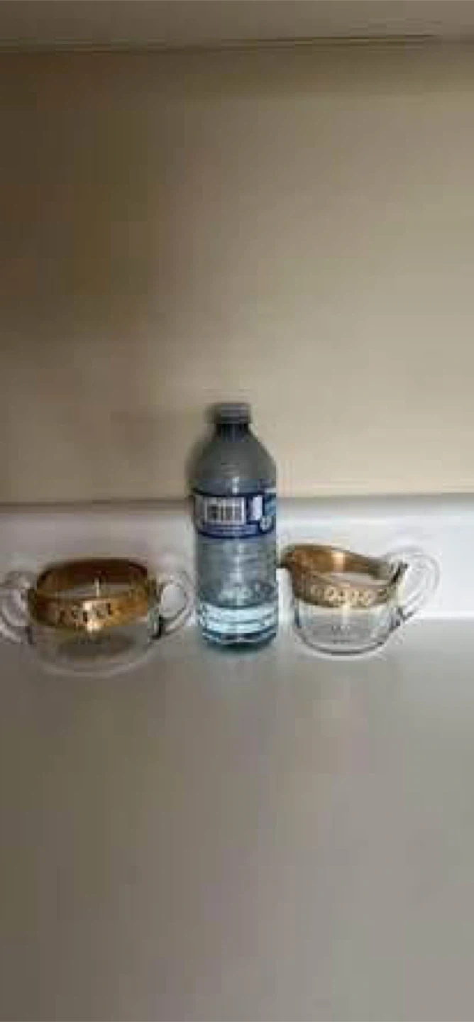 Selling a lovely vintage clear glass cream and sugar set. They feature delicate floral details and gold trim. Perfect for adding a touch of elegance to your table setting!
