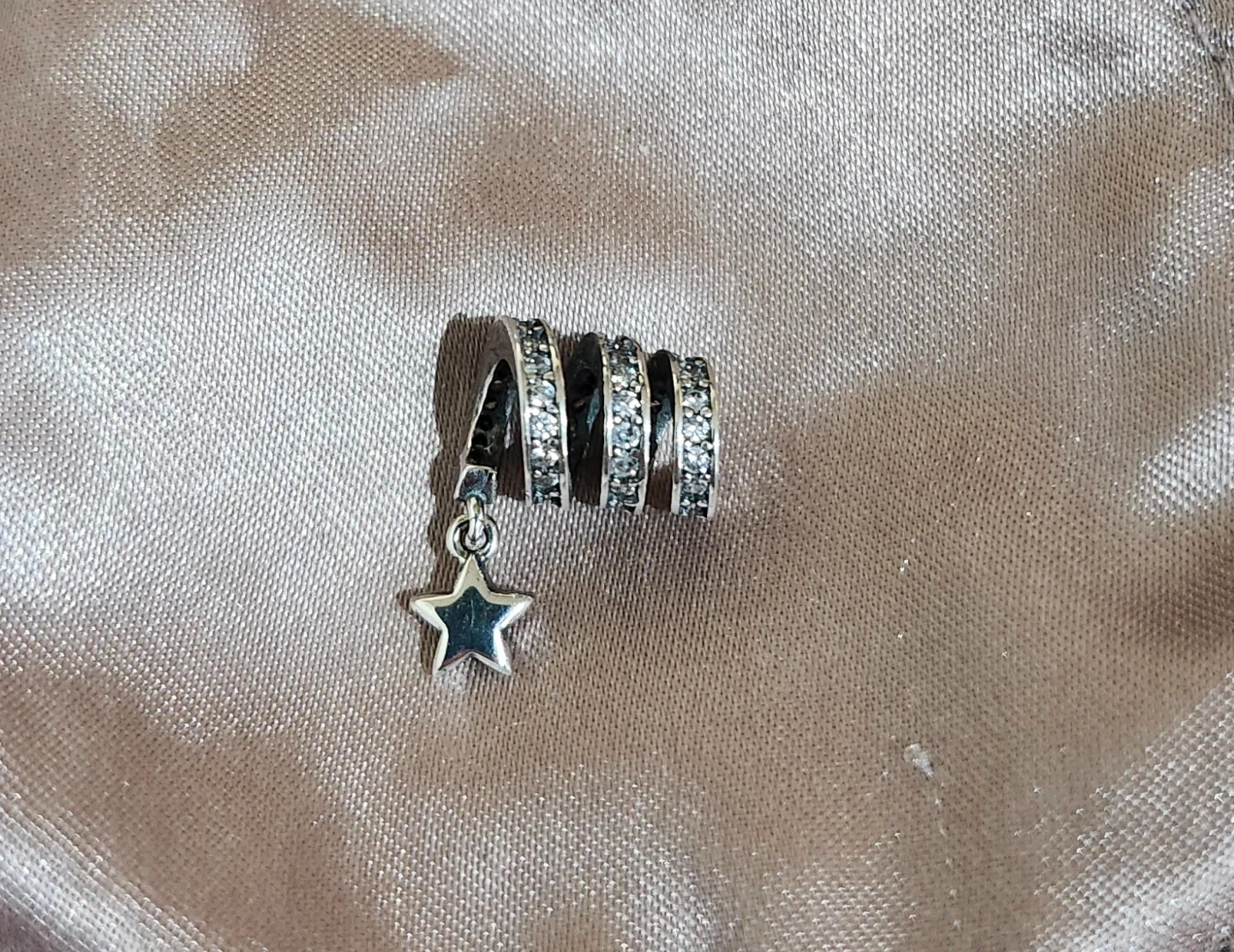Add a touch of celestial sparkle to your bracelet with this sterling silver charm. It's designed as a spiral with clear cubic zirconia stones and a dangling star. This charm is perfect for adding a personal touch to your bracelet!