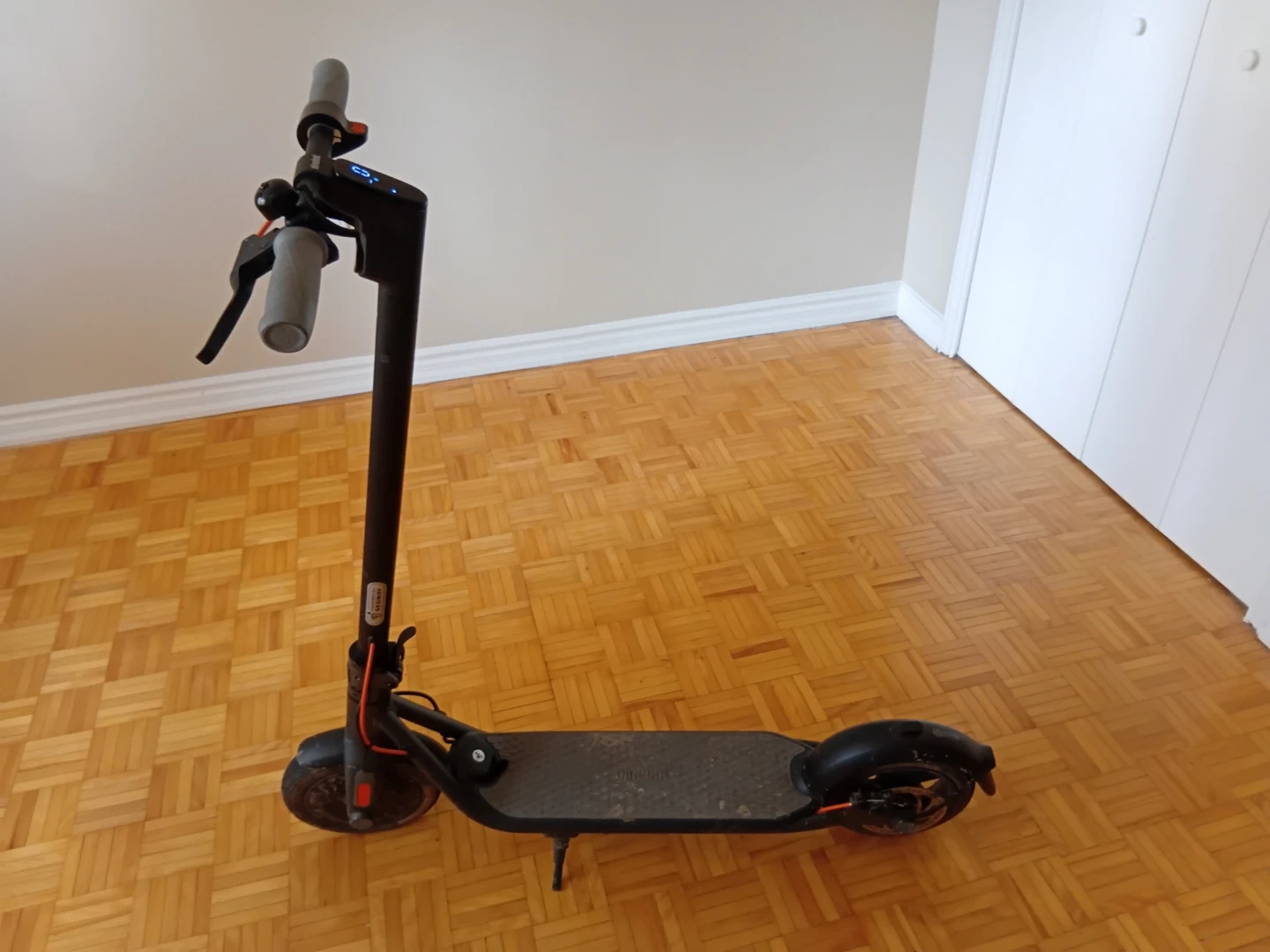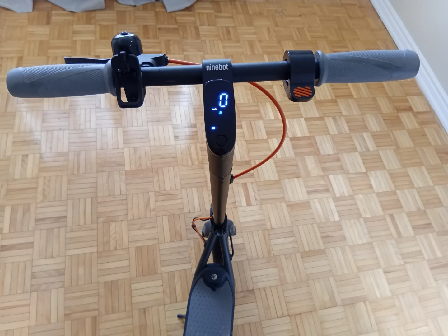 This is a Ninebot electric scooter. It features a digital display for speed and battery life. The handlebars are grey with black grips. 25km/hr 25km range on eco mode