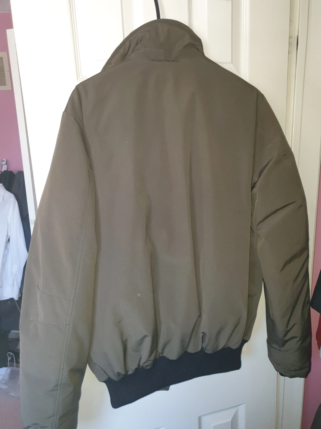 Company of Adventurers bomber jacket in olive green. It's a size medium. Jacket has a full zip front and ribbed cuffs and hem.