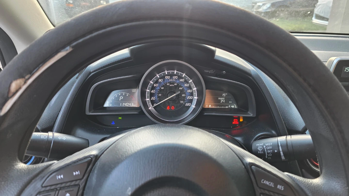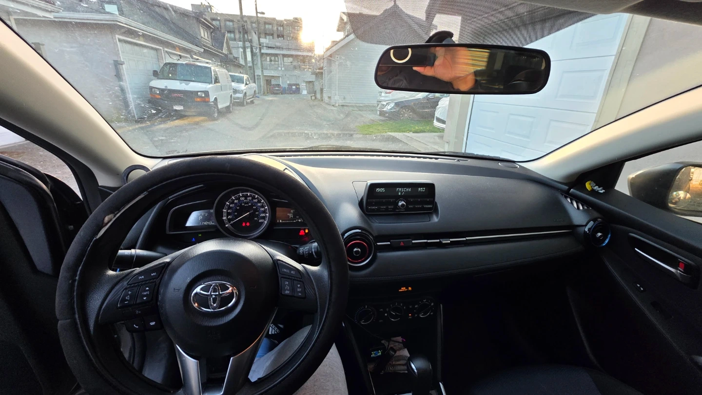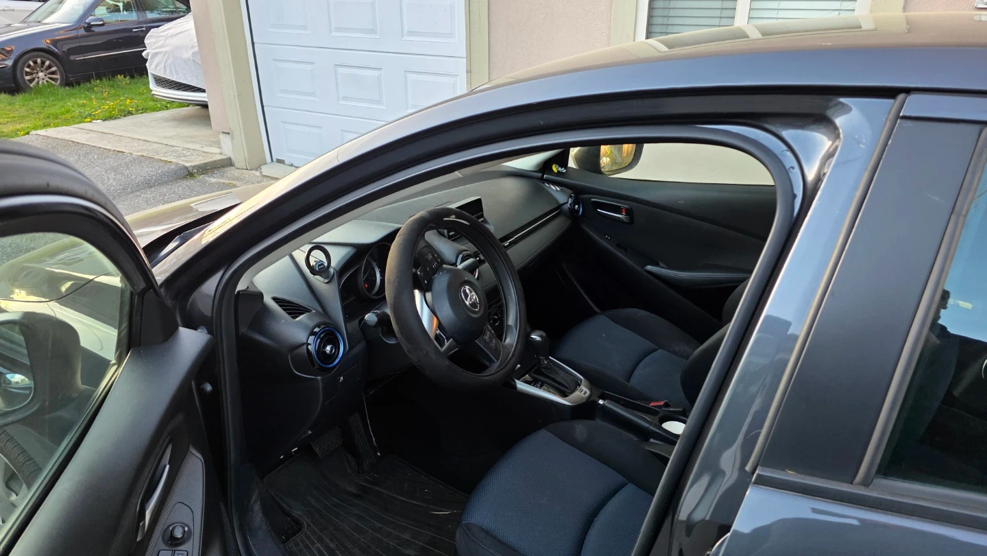Dark grey 2016 Toyota Yaris sedan. This car has a 1.5L engine and automatic transmission. It's currently at 114,043 km. Interior is black cloth.