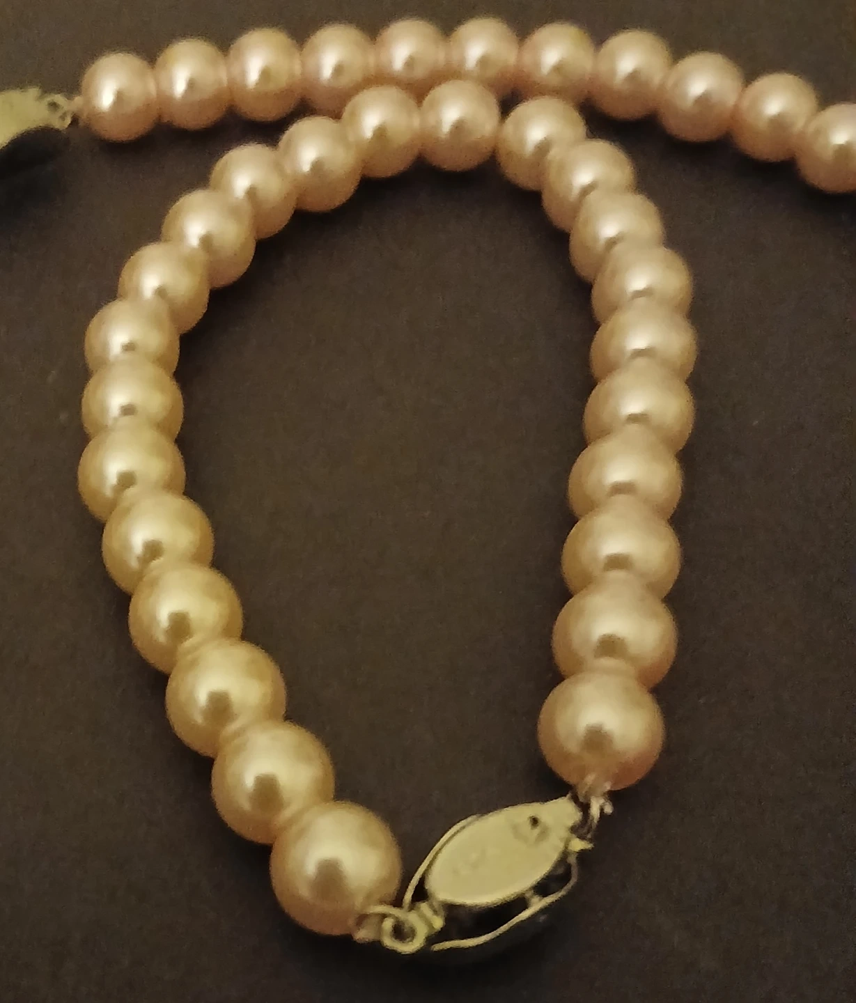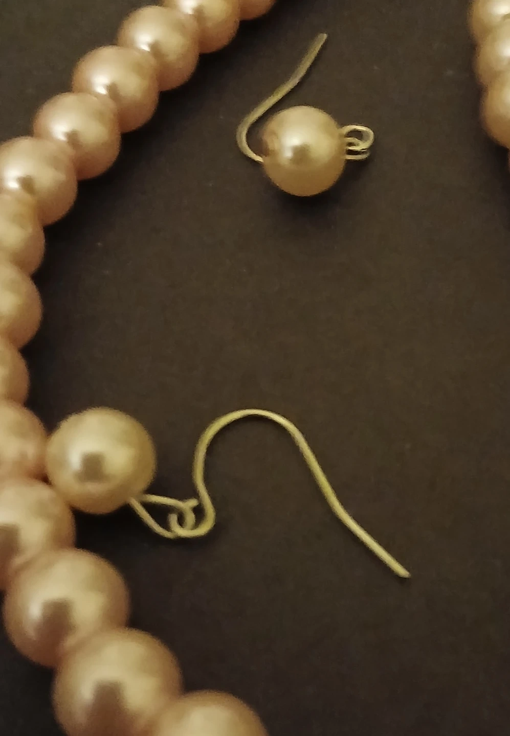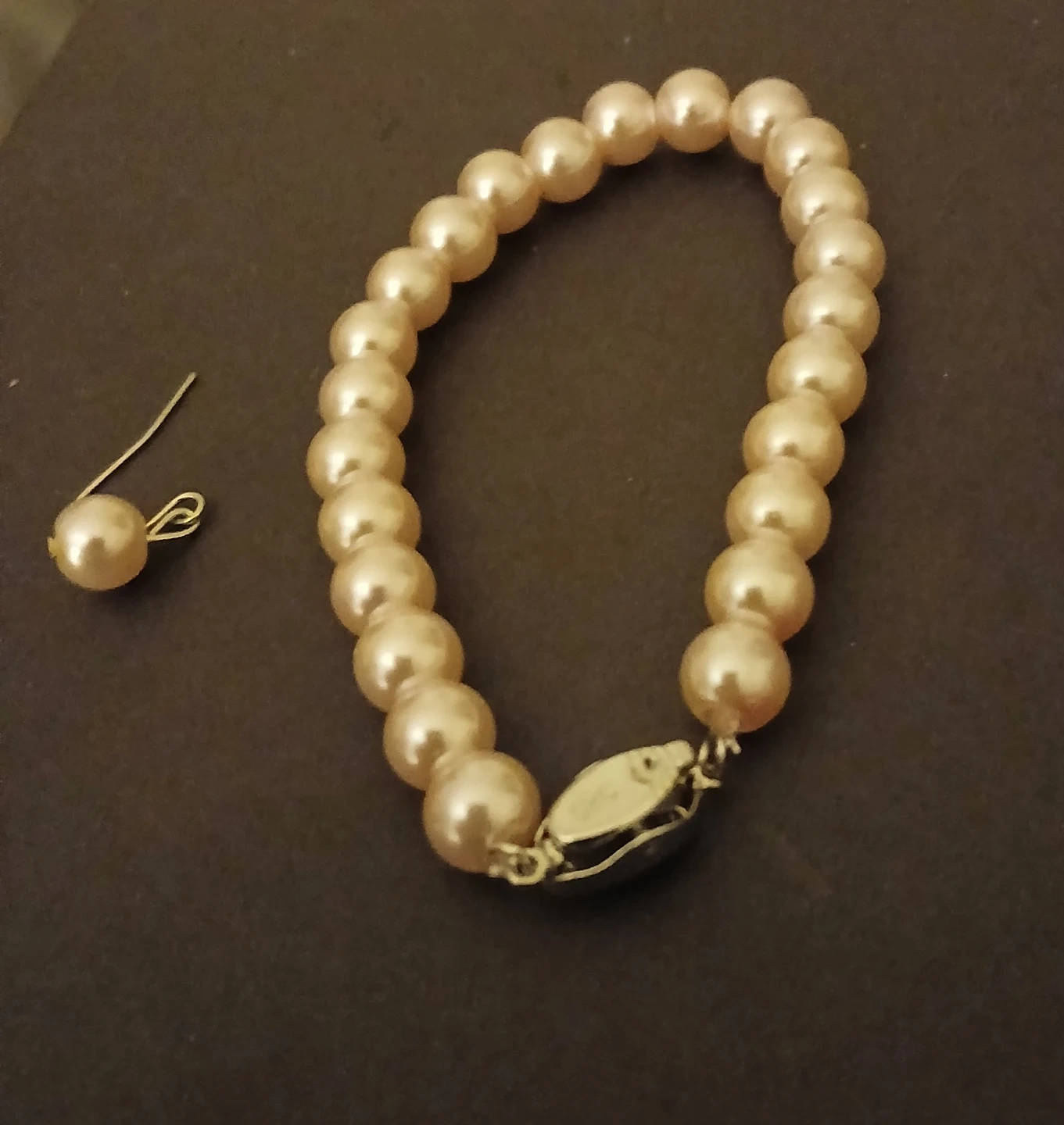 This is a classic pearl jewellery set. It includes a necklace, a bracelet, and a pair of earrings. The pearls are a lovely shade of cream. They're perfect for dressing up any outfit!